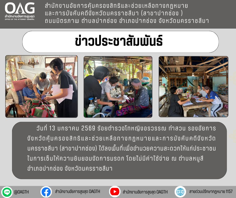 วันที่ 13 มกราคม 2569 ร้อยตำรวจโทหญิงอรวรรณ ทำสวน รองอัยการจังหวัดคุ้มครองสิทธิและช่วยเหลือทางกฎหมายและการบังคับคดีจังหวัดนครราชสีมา (สาขาปากช่อง) ได้ลงพื้นที่เพื่ออำนวยความสะดวกให้แก่ประชาชนในการเซ็นให้ความยินยอมจัดการมรดก โดยไม่มีค่าใช้จ่าย ณ ตำบลหมูสี อำเภอปากช่อง จังหวัดนครราชสีมา