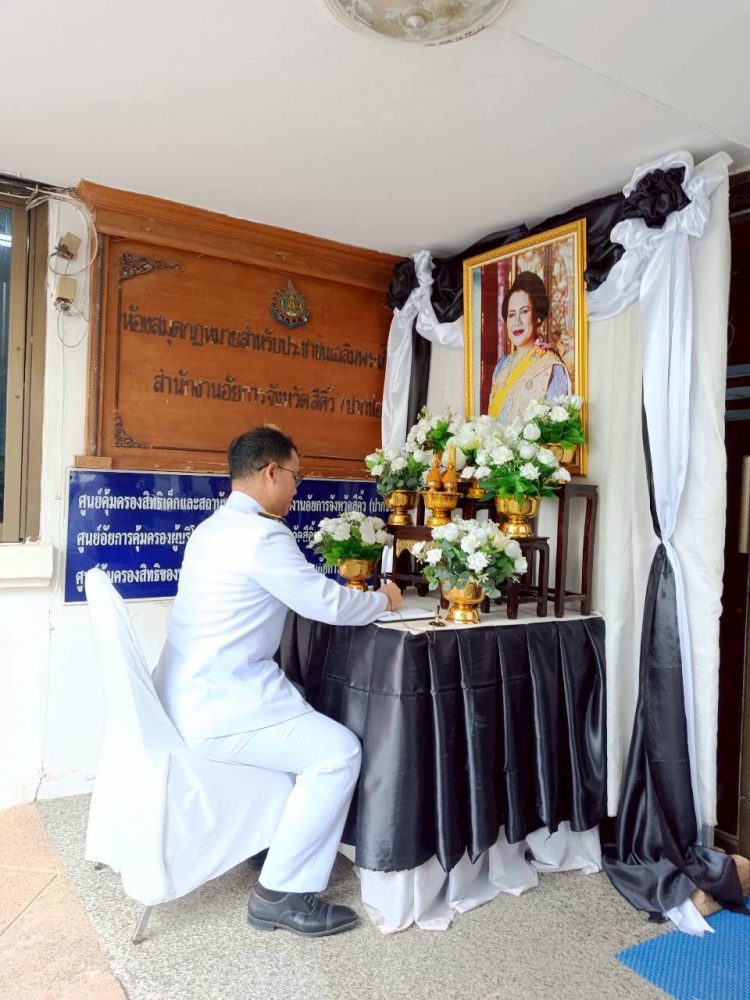 นายศุภโชค เนตรนิยม อัยการจังหวัดสีคิ้ว (ปากช่อง) และบุคลากรสำนักงานอัยการจังหวัดสีคิ้ว (ปากช่อง) จัดพิธีลงนามถวายความอาลัย สมเด็จพระนางเจ้าสิริกิติ์ พระบรมราชินีนาถ พระบรมราชชนนีพันปีหลวง ในวันพุธที่ 29 ตุลาคม 2568 ณ บริเวณหน้าอาคารสำนักงานอัยการจังหวัดสีคิ้ว (ปากช่อง)
