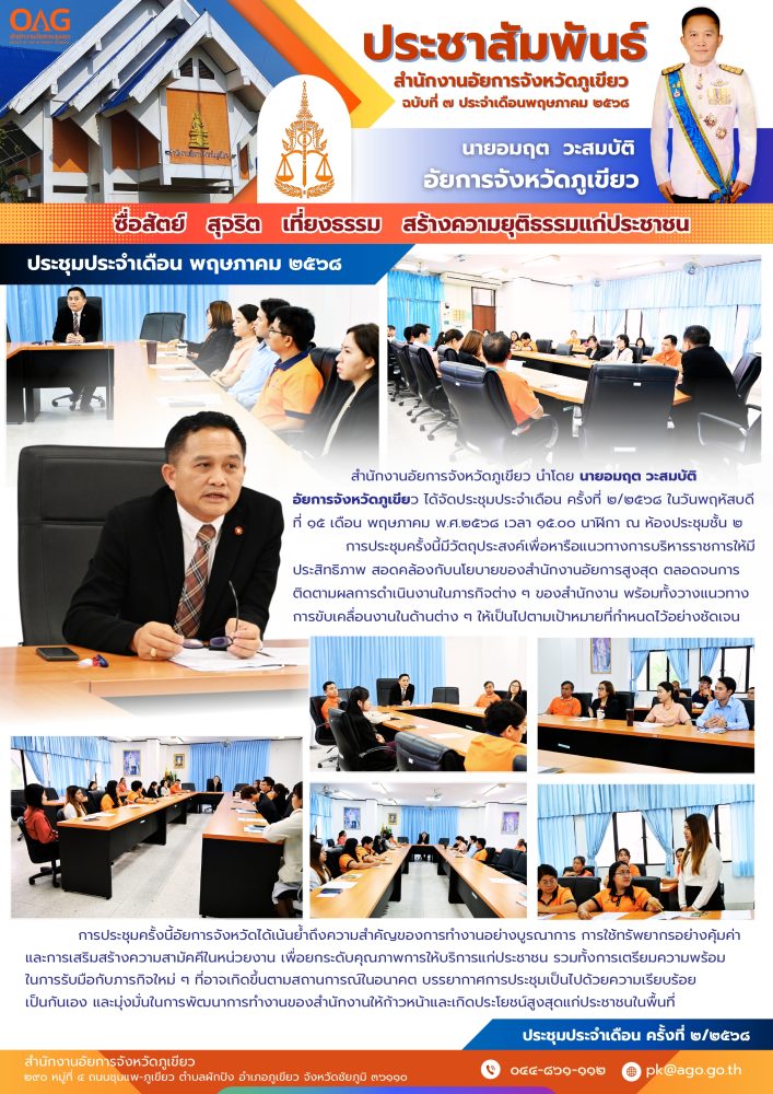 สำนักงานอัยการจังหวัดภูเขียว นำโดย นายอมฤต วะสมบัติ อัยการจังหวัดภูเขียว ได้จัดประชุมประจำเดือน ครั้งที่ ๒/๒๕๖๘ ขึ้นในวันพฤหัสบดีที่ ๑๕ พฤษภาคม ๒๕๖๘ เวลา ๑๕.๐๐ นาฬิกา ณ ห้องประชุมชั้น ๒ สำนักงานอัยการจังหวัดภูเขียว การประชุมครั้งนี้มีวัตถุประสงค์เพื่อหารือแนวทางการบริหารราชการให้มีประสิทธิภาพ สอดคล้องกับนโยบายของสำนักงานอัยการสูงสุด ตลอดจนการติดตามผลการดำเนินงานในภารกิจต่าง ๆ ของสำนักงาน พร้อมทั้งวางแนวทางการขับเคลื่อนงานในด้านต่าง ๆ ให้เป็นไปตามเป้าหมายที่กำหนดไว้อย่างชัดเจน ในการนี้ อัยการจังหวัดได้เน้นย้ำถึงความสำคัญของการทำงานอย่างบูรณาการ การใช้ทรัพยากรอย่างคุ้มค่า และการเสริมสร้างความสามัคคีในหน่วยงาน เพื่อยกระดับคุณภาพการให้บริการแก่ประชาชน รวมทั้งการเตรียมความพร้อมในการรับมือกับภารกิจใหม่ ๆ ที่อาจเกิดขึ้นตามสถานการณ์ในอนาคต บรรยากาศการประชุมเป็นไปด้วยความเรียบร้อย เป็นกันเอง และมุ่งมั่นในการพัฒนาการทำงานของสำนักงานให้ก้าวหน้าและเกิดประโยชน์สูงสุดแก่ประชาชนในพื้น