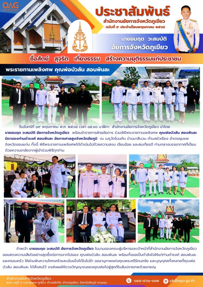 วันจันทร์ที่ ๑๙ พฤษภาคม พ.ศ. ๒๕๖๘ เวลา ๑๕.๐๐ นาฬิกา สำนักงานอัยการจังหวัดภูเขียว นำโดย นายอมฤต วะสมบัติ อัยการจังหวัดภูเขียว พร้อมข้าราชการฝ่ายอัยการ ร่วมพิธีพระราชทานเพลิงศพ คุณพ่อบัวลัน สอนพันละ บิดาของท่านดำรงค์ สอนพันละ อัยการศาลสูงจังหวัดชัยภูมิ ณ เมรุวัดโนนทัน บ้านนาสีนวน ตำบลขัวเรียง อำเภอชุมแพ จังหวัดขอนแก่น ทั้งนี้ พิธีพระราชทานเพลิงศพได้ดำเนินไปด้วยความสงบ เรียบร้อย และสมเกียรติ ท่ามกลางบรรยากาศที่เปี่ยมด้วยความอาลัยจากผู้เข้าร่วมพิธีทุกท่าน ข้าพเจ้า นายอมฤต วะสมบัติ อัยการจังหวัดภูเขียว ในนามของคณะผู้บริหารและเจ้าหน้าที่สำนักงานอัยการจังหวัดภูเขียว ขอแสดงความเสียใจอย่างสุดซึ้งต่อการจากไปของ คุณพ่อบัวลัน สอนพันละ พร้อมทั้งขอเป็นกำลังใจให้แก่ท่านดำรงค์ สอนพันละ และครอบครัว ให้ผ่านพ้นความโศกเศร้าและเข้มแข็งได้ในไม่ช้า ขออานุภาพแห่งคุณพระศรีรัตนตรัย และบุญกุศลทั้งหลายที่คุณพ่อ บัวลัน สอนพันละ ได้สั่งสมไว้ จงส่งผลให้ดวงวิญญาณของคุณพ่อไปสู่สุคติในสัมปรายภพด้วยเทอญ