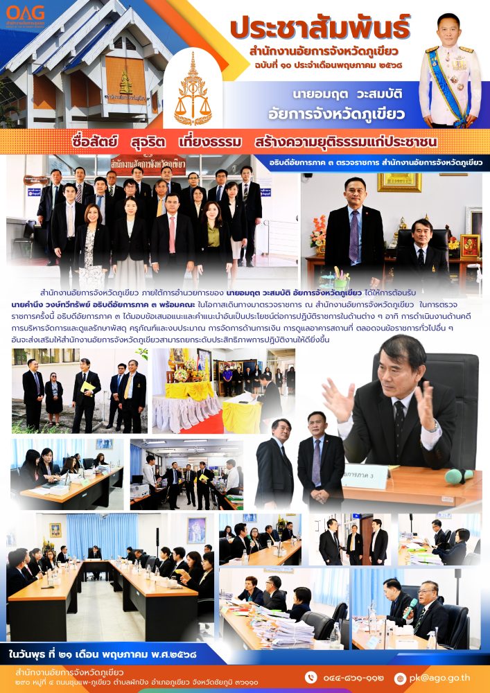 วันพุธที่ ๒๑ เดือน พฤษภาคม พ.ศ.๒๕๖๘ สำนักงานอัยการจังหวัดภูเขียว ภายใต้การอำนวยการของ นายอมฤต วะสมบัติ อัยการจังหวัดภูเขียว ได้ให้การต้อนรับ นายคำนึง วงษ์ทวีทรัพย์ อธิบดีอัยการภาค ๓ พร้อมคณะ ในโอกาสเดินทางมาตรวจราชการ ณ สำนักงานอัยการจังหวัดภูเขียว ในการตรวจราชการครั้งนี้ อธิบดีอัยการภาค ๓ ได้มอบข้อเสนอแนะและคำแนะนำอันเป็นประโยชน์ต่อการปฏิบัติราชการในด้านต่าง ๆ อาทิ การดำเนินงานด้านคดี การบริหารจัดการและดูแลรักษาพัสดุ ครุภัณฑ์และงบประมาณ การจัดการด้านการเงิน การดูแลอาคารสถานที่ ตลอดจนข้อราชการทั่วไปอื่น ๆ อันจะส่งเสริมให้สำนักงานอัยการจังหวัดภูเขียวสามารถยกระดับประสิทธิภาพการปฏิบัติงานให้ดียิ่งขึ้น