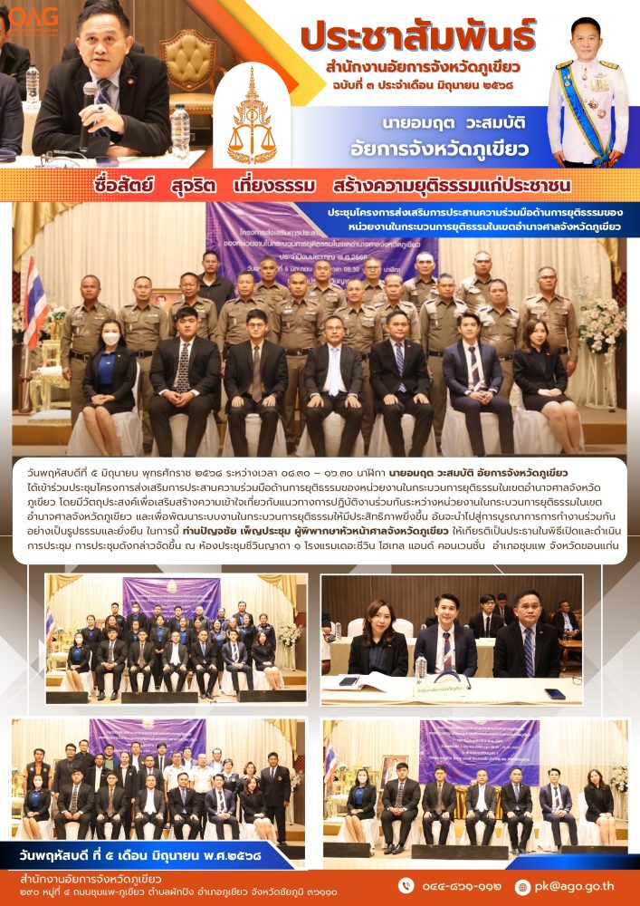 วันพฤหัสบดีที่ ๕ มิถุนายน พุทธศักราช ๒๕๖๘ ระหว่างเวลา ๐๘.๓๐ – ๑๖.๓๐ นาฬิกา นายอมฤต วะสมบัติ อัยการจังหวัดภูเขียว ได้เข้าร่วมประชุมโครงการส่งเสริมการประสานความร่วมมือด้านการยุติธรรมของหน่วยงานในกระบวนการยุติธรรมในเขตอำนาจศาลจังหวัดภูเขียว โดยมีวัตถุประสงค์เพื่อเสริมสร้างความเข้าใจเกี่ยวกับแนวทางการปฏิบัติงานร่วมกันระหว่างหน่วยงานในกระบวนการยุติธรรมในเขตอำนาจศาลจังหวัดภูเขียว และเพื่อพัฒนาระบบงานในกระบวนการยุติธรรมให้มีประสิทธิภาพยิ่งขึ้น อันจะนำไปสู่การบูรณาการการทำงานร่วมกันอย่างเป็นรูปธรรมและยั่งยืน ในการนี้ ท่านปัญจชัย เพ็ญประชุม ผู้พิพากษาหัวหน้าศาลจังหวัดภูเขียว ให้เกียรติเป็นประธานในพิธีเปิดและดำเนินการประชุม การประชุมดังกล่าวจัดขึ้น ณ ห้องประชุมชีวินญาดา ๑ โรงแรมเดอะชีวิน โฮเทล แอนด์ คอนเวนชั่น อำเภอชุมแพ จังหวัดขอนแก่น