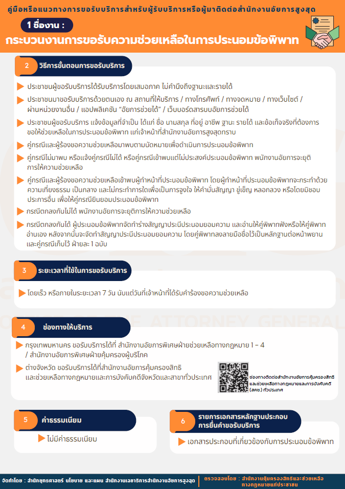 (๑) การให้คำปรึกษาปัญหาทางกฎหมาย ช่วยเหลือจัดทำนิติกรรมสัญญา และประนอมข้อพิพาท