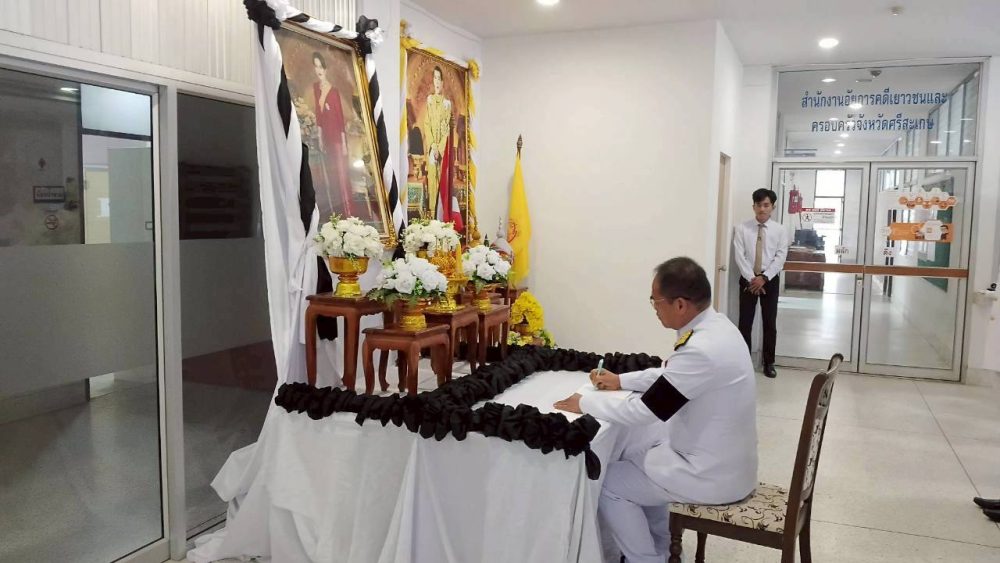 วันที่ ๓๐ ตุลาคม ๒๕๖๘ นายเทพพงค์ ยงกุล อัยการจังหวัดคุ้มครองสิทธิและช่วยเหลือทางกฎหมายและการบังคับคดีจังหวัดศรีสะเกษ พร้อมบุคลากรในสังกัด เข้าร่วมพิธีลงนามถวายความอาลัย สมเด็จพระนางเจ้าสิริกิติ์ พระบรมราชินีนาถ พระบรมราชชนนีพันปีหลวง ณ อาคารสำนักงานอัยการจังหวัดศรีสะเกษ