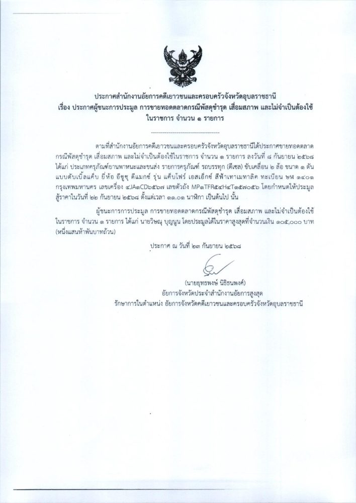 เรื่อง ประกาศผู้ชนะการประมูล ขายทอดตลาดกรณีพัสดุชำรุด เสื่อมสภาพ และไม่จำเป็นต้องใช้ในราชการ จำนวน 1 รายการ