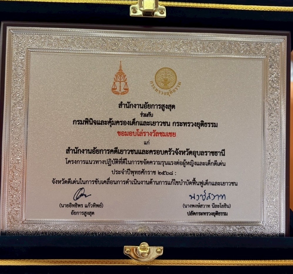เมื่อวันจันทร์ ที่ 8 ธันวาคม 2568 นายยุทธพงษ์ นิธิธนพงศ์ อัยการจังหวัดคดีเยาวชนและครอบครัวจังหวัดอุบลราชธานี และนางสาวพรรณี บุญมี ผู้อำนวยการสำนักอำนวยการ สำนักอัยการคดีเยาวชนและครอบครัวจังหวัดอุบลราชธานี เป็นตัวแทนสำนักอัยการคดีเยาวชนและครอบครัวจังหวัดอุบลราชธานี และสถานพินิจและคุ้มครองเด็กและเยาวชนจังหวัดอุบลราชธานี เข้ารับโล่รางวัลชมเชยผลการประกวดโครงการจังหวัดดีเด่นในการขับเคลื่อนการดำเนินงานด้านการแก้ไขบำบัดฟื้นฟูเด็กและเยาวชน ประจำปี 2568 จากผลงานการจัดกิจกรรมสร้างความตระหนักรู้และใช้สื่อวิดีทัศน์ในการขยายผลมาตรา 86 โดยจัดกิจกรรมอบรมและเผยแพร่ความรู้ให้แก่ประชาชนและหน่วยงานที่เกี่ยวข้องในพื้นที่ รวมถึงกลุ่มเยาวชนที่เป็นเพศทางเลือก ส่งเสริมการใช้แนวทางยุติธรรมสมานฉันท์ (Restorative Justice) และผลักดันให้มาตรา 86 แห่งพระราชบัญญัติศาลเยาวชนและครอบครัวและวิธีพิจารณาคดีเยาวชนและครอบครัว พ.ศ. 2553 เป็นส่วนหนึ่งของการบริหารงานยุติธรรม ณ ห้องประชุม 120 ปี สำนักงานอัยการสูงสุด อาคารราชบุรีดิเรกฤทธิ์ ศูนย์ราชการเฉลิมพระเกียรติฯ ถนนแจ้งวัฒนะ เขตหลักสี่ กรุงเทพมหานคร