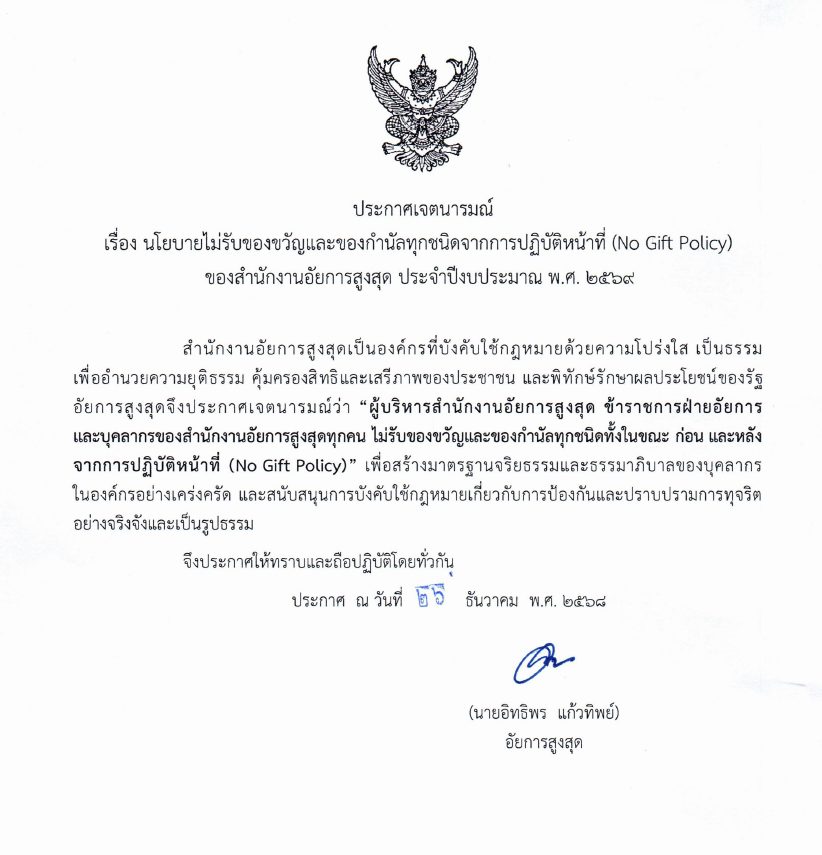 เมื่อวันจันทร์ ที่ 5 มกราคม 2569 เวลา 11.00 นาฬิกา สำนักงานอัยการคดีเยาวชนและครอบครัวจังหวัดอุบลราชธานีได้ดำเนินการจัดการประชุมบุคลากรภายในสำนักงาน โดยมีนายยุทธพงษ์ นิธิธนพงศ์ อัยการจังหวัดคดีเยาวชนและครอบครัวจังหวัดอุบลราชธานี เป็นประธานที่ในที่ประชุม โดยการจัดการประชุมครั้งนี้เพื่อแจ้งให้บุคลากรทุกคนในสำนักงานทราบถึงเจตนารมณ์ของอัยการสูงสุด เรื่อง “ผู้บริหารสำนักงานอัยการสูงสุด ข้าราชการฝ่ายอัยการ และบุคคลากรของสำนักงานอัยการสูงสุดทุกคน ไม่รับของขวัญและของกำนัลทุกชนิดทั้งในขณะ ก่อน และหลังจากการปฏิบัติหน้าที่ (NO Gift Policy)”