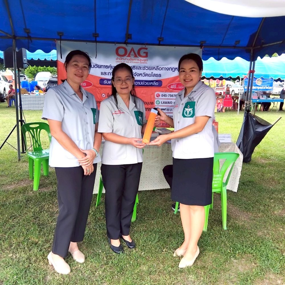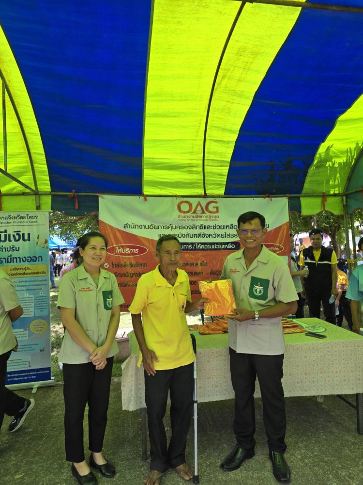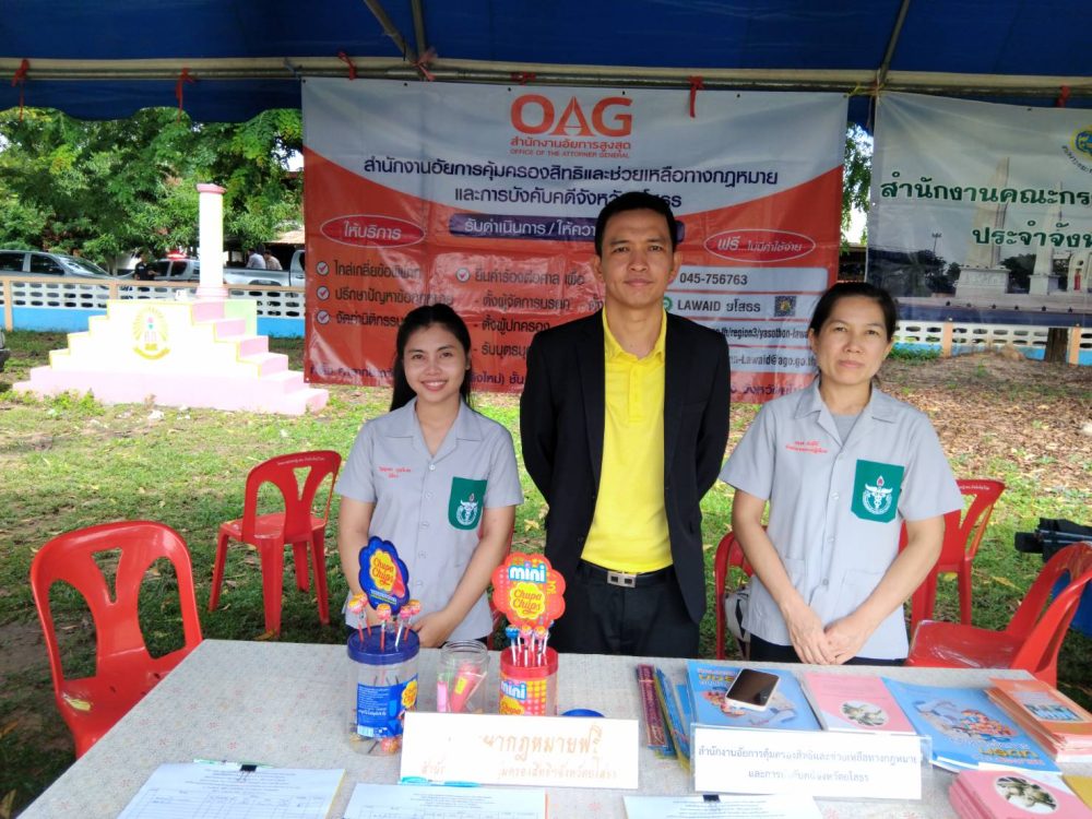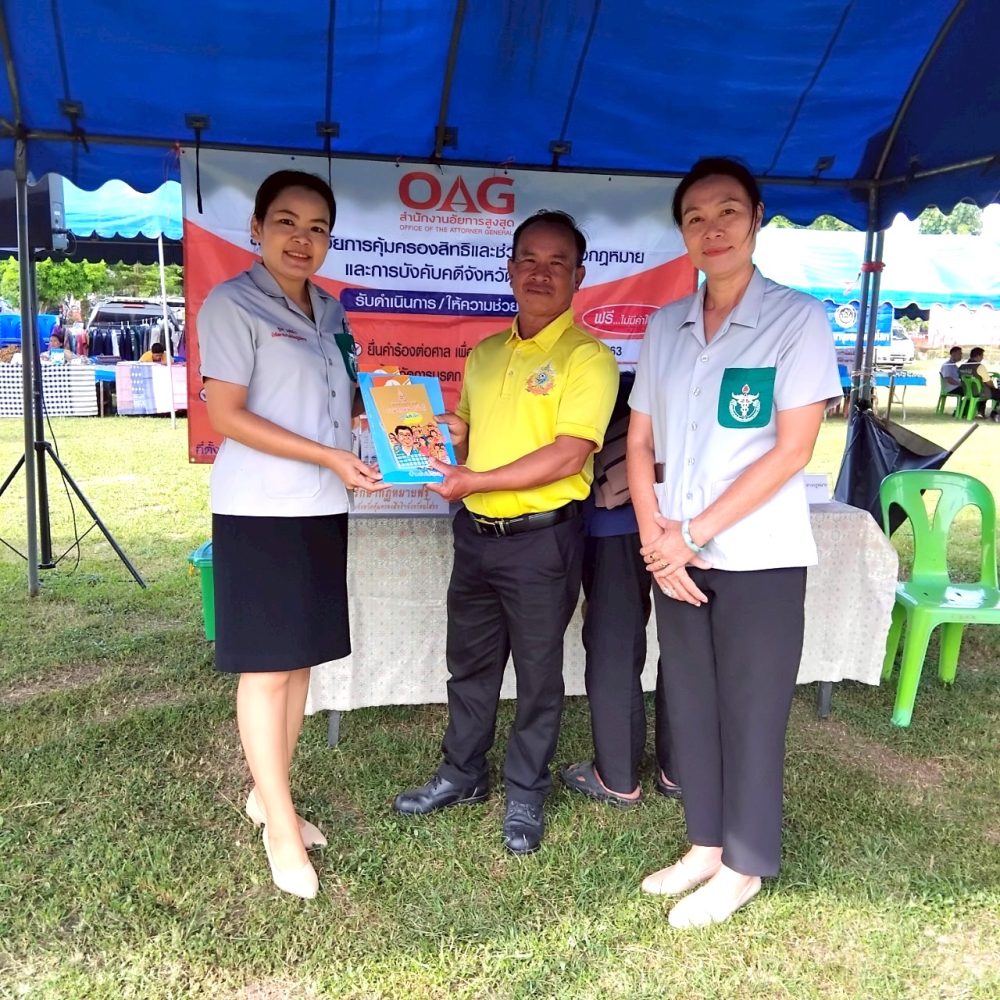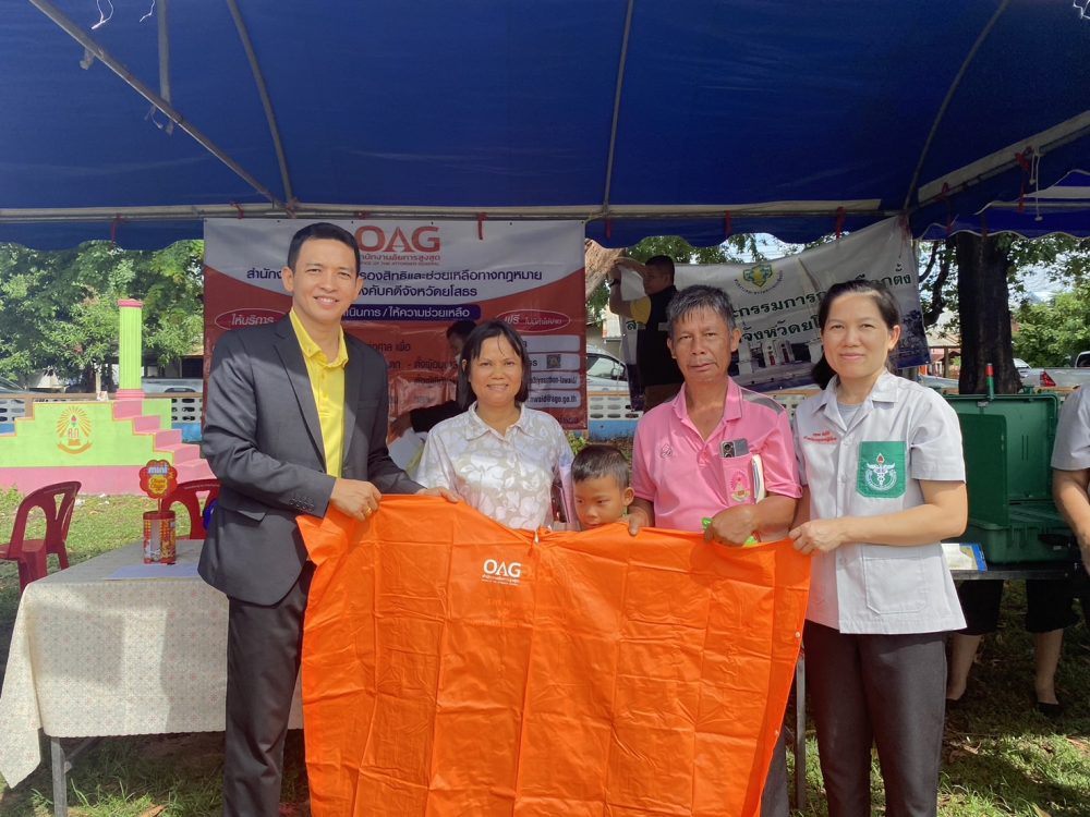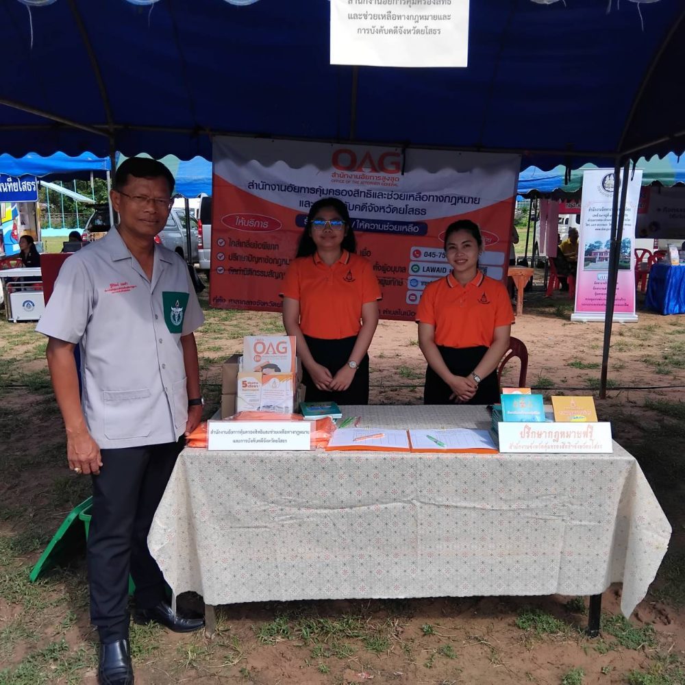 วันที่ ๓ กรกฎาคม ๒๕๖๗ เวลา ๐๘.๐๐ นาฬิกา นายสุรชัย ยิ่งยงวรชัย อัยการจังหวัดประจำสำนักงานอัยการสูงสุด พร้อมเจ้าหน้าที่ ร่วมออกปฏิบัติงานหน่วยแพทย์อาสาสมเด็จพระศรีนครินทราบรมราชชนนี (พอ.สว.) ร่วมกับโครงการจังหวัดเคลื่อนที่ “เพิ่มรอยยิ้ม เติมความสุข ให้คนยโสธร” ปีงบประมาณ พ.ศ.๒๕๖๗ เพื่อให้คำปรึกษากฎหมายทั่วไปให้กับประชาชน แจกเอกสาร และประชาสัมพันธ์ พันธกิจ ภารกิจ ของสำนักงานอัยการสูงสุด ณ บ้านศรีแก้ว ตำบลศรีแก้ว อำเภอเลิงนกทา จังหวัดยโสธร