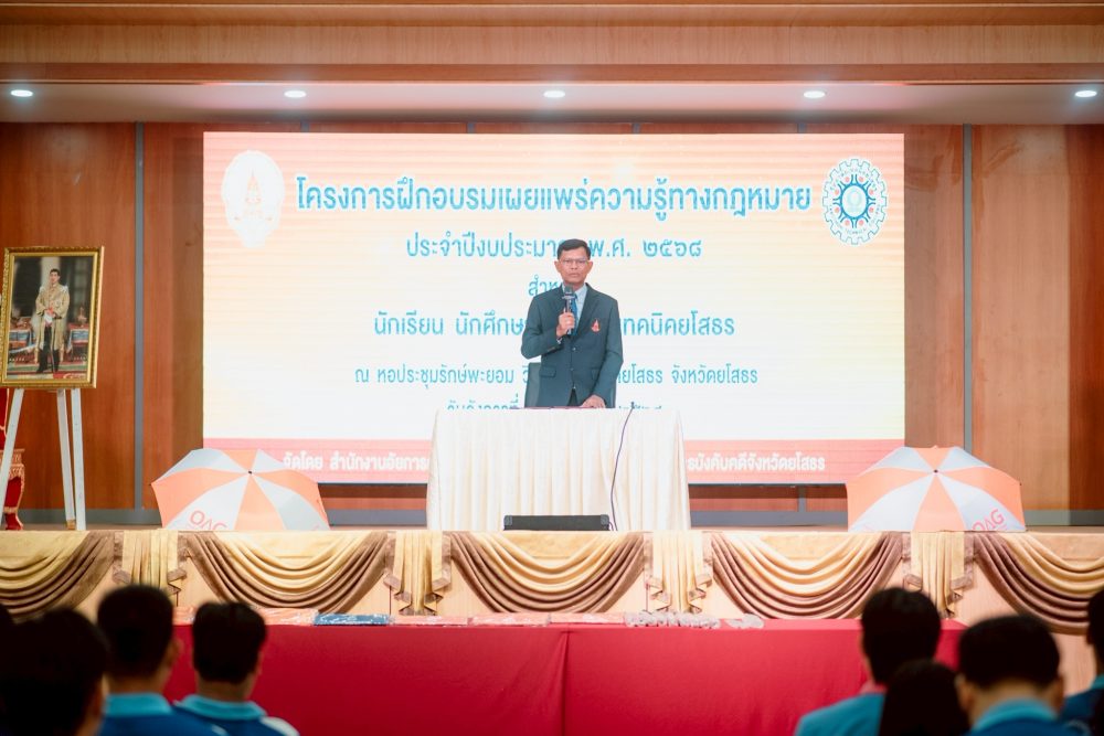 วันที่ ๑ กรกฎาคม ๒๕๖๘ เวลา ๐๘.๓๐ นาฬิกา สำนักงานอัยการคุ้มครองสิทธิและช่วยเหลือทางกฎหมายและการบังคับคดีจังหวัดยโสธร ได้จัดโครงการฝึกอบรมเผยแพร่ทางกฎหมาย สำหรับ นักเรียน นักศึกษา วิทยาลัยเทคนิคยโสธร จำนวน ๓๘๐ คน ให้มีความรู้เบื้องต้นทางกฎหมายที่เกี่ยวข้องในการดำเนินชีวิตประจำวัน ตลอดจนการปฏิบัติตนให้มีคุณธรรม จริยธรรม และระเบียบวินัย ณ หอประชุมรักษ์พะยอม วิทยาลัยเทคนิคยโสธร ตำบลสำราญ อำเภอเมืองยโสธร จังหวัดยโสธร
