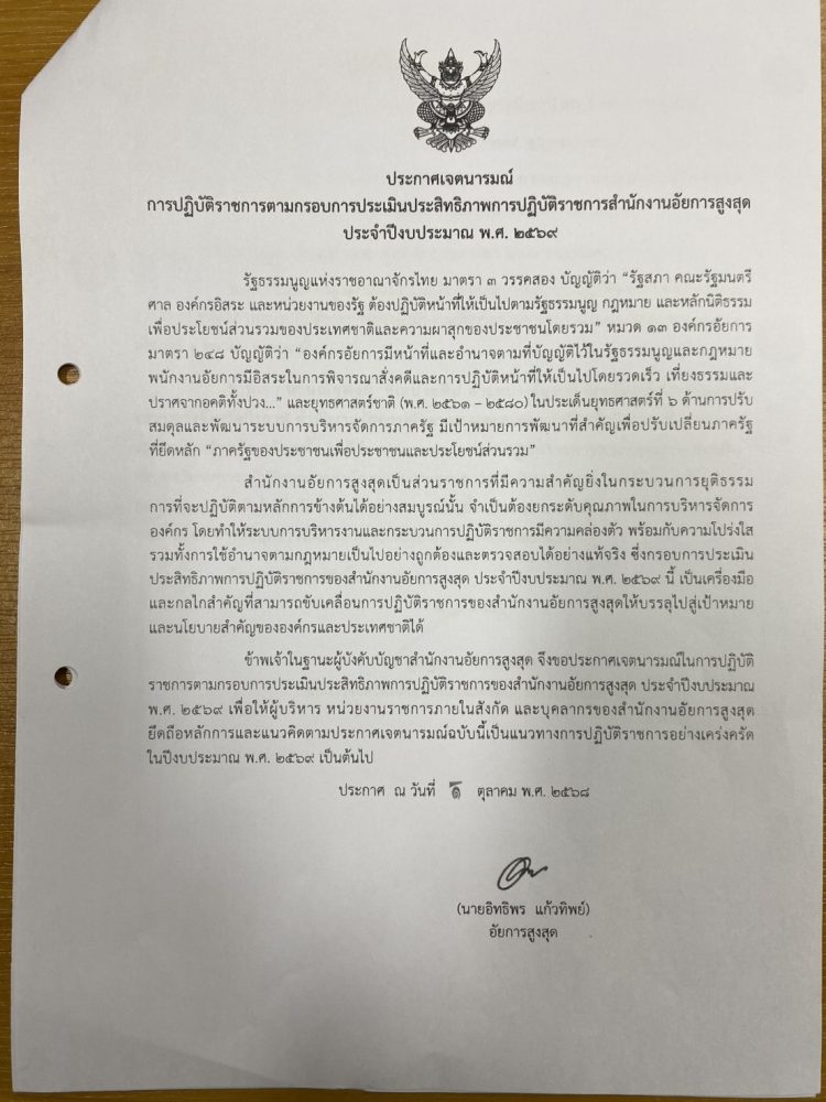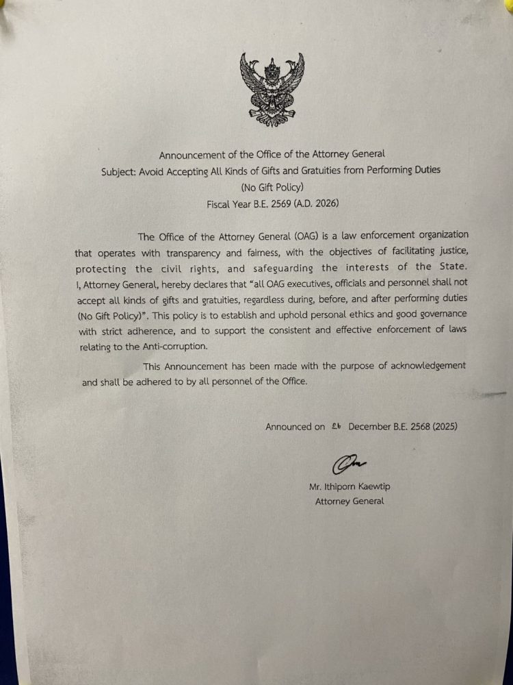 สำนักงานอัยการคดีเยาวชนและครอบครัวจังหวัดบึงกาฬ โดยนายณัฐพงศ์ ชิณประทีป อัยการจังหวัดคดีเยาวชนและครอบครัวจังหวัดบึงกาฬ จัดให้มีประชุมประจำปี 2569 ครั้งที่ 5 เพื่อปรึกษาหารือเกี่ยวกับปัญหาข้อขัดข้องในการปฏิบัติงาน และเผยแพร่และถ่ายทอดประกาศเจตนารมณ์ เรื่อง ไม่รับของขวัญและของกำนัลทุกชนิดจากการปฏิบัติหน้าที่ (No Gift Policy) ของสำนักงานอัยการสูงสุด และให้บุคลากรในสังกัด จำนวน 8 ลงนามรับทราบและร่วมขับเคลื่อนประกาศเจตนารมณ์