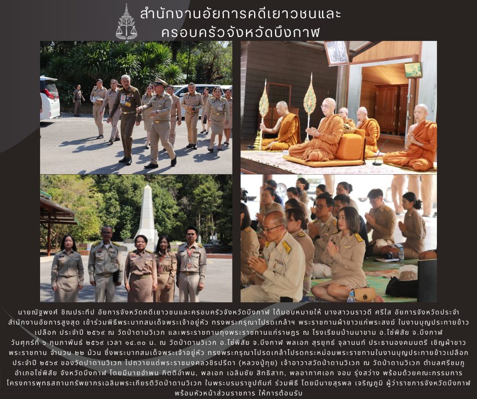 นายณัฐพงศ์ ชิณประทีป อัยการจังหวัดคดีเยาวชนและครอบครัวจังหวัดบึงกาฬ ได้มอบหมายให้ นางสาวนวพร บุญศร อัยการประจำกอง พร้อมคณะข้าราชการสำนักงานเวลา 07.00 น. พิธีเจริญพระพุทธมนต์และทำบุญตักบาตรถวายพระราชกุศล ณ บริเวณศาลาอเนกประสงค์ริมโขง ถนนข้าวเม่าริมโขง อำเภอเมืองบึงกาฬ จังหวัดบึงกาฬ และเวลา 09.00 น. พิธีเจริญพระพุทธมนต์สมโภชพระเจดีย์หรือพระพุทธรูปสำคัญประจำจังหวัดบึงกาฬ เฉลิมพระเกียรติสมเด็จพระนางเจ้าสิริกิติ์ พระบรมราชินีนาถ พระบรมราชชนนีพันปีหลวง เนื่องในโอกาสวันเฉลิมพระชนมพรรษา 12 สิงหาคม 2568 ณ วัดศรโสภณธรรมทาน (วัดใต้) อำเภอเมืองบึงกาฬ จังหวัดบึงกาฬ และเวลา 10.30 น. กิจกรรมจิตอาสาเนื่องในวันเฉลิมพระชนมพรรษาสมเด็จพระนางเจ้าสิริกิติ์ พระบรมราชินีนาถ พระบรมราชชนนีพันปีหลวง และวันแม่แห่งชาติ 12 สิงหาคม 2568 ณ วัดสมถธรรมคุณ บ้านห้วยบอนพัฒนา ตำบลนาสวรรค์ อำเภอเมืองบึงกาฬ จังหวัดบึงกาฬ