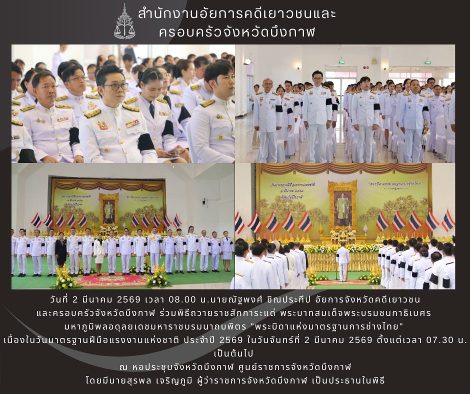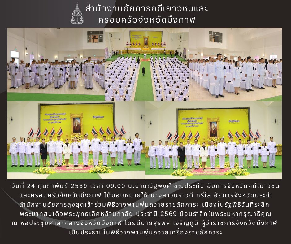 นายณัฐพงศ์ ชิณประทีป อัยการจังหวัดคดีเยาวชนและครอบครัวจังหวัดบึงกาฬ ได้มอบหมายให้ นางสาวนราวดี ศรีใส อัยการจังหวัดประจำสำนักงานอัยการสูงสุด เข้าร่วมพิธีวางพานพุ่มวันพระบิดาแห่งฝนหลวง น้อมรำลึกพระมหากรุณาธิคุณของในหลวงรัชกาลที่ 9 ในวันที่ 14 พฤศจิกายน 2568 ณ หอประชุมศาลากลางจังหวัดบึงกาฬ