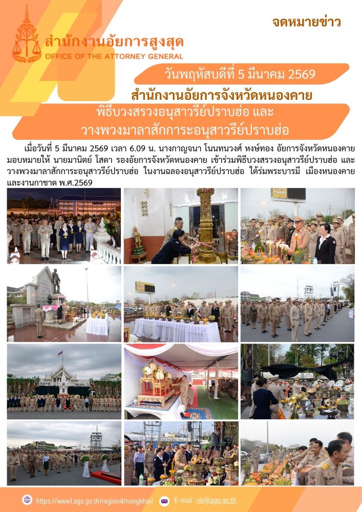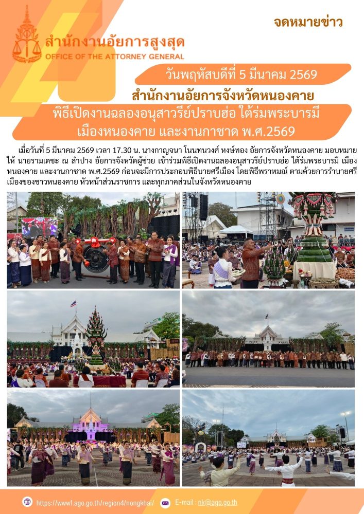 วันที่ 6 เมษายน 2567 สำนักงานอัยการจังหวัดหนองคาย นำโดยท่านณัฐนัย สุขมี อัยการจังหวัดหนองคาย พร้อมด้วยคณะข้าราชการฝ่ายอัยการ ร่วมงานรัฐพิธี “วันพระบาทสมเด็จพระพุทธยอดฟ้าจุฬาโลกมหาราชและวันที่ระลึกมหาจักรีบรมราชวงศ์” ประจำปีพุทธศักราช 2567 ณ ศาลาหลวงพ่อพระใส วัดโพธิ์ชัย พระอารามหลวง และหอประชุมประจักษศิลปาคม ศาลากลางจังหวัดหนองคาย