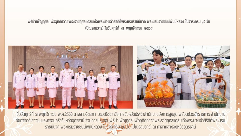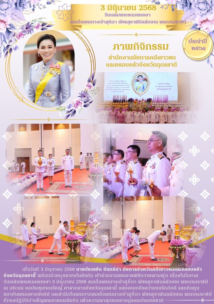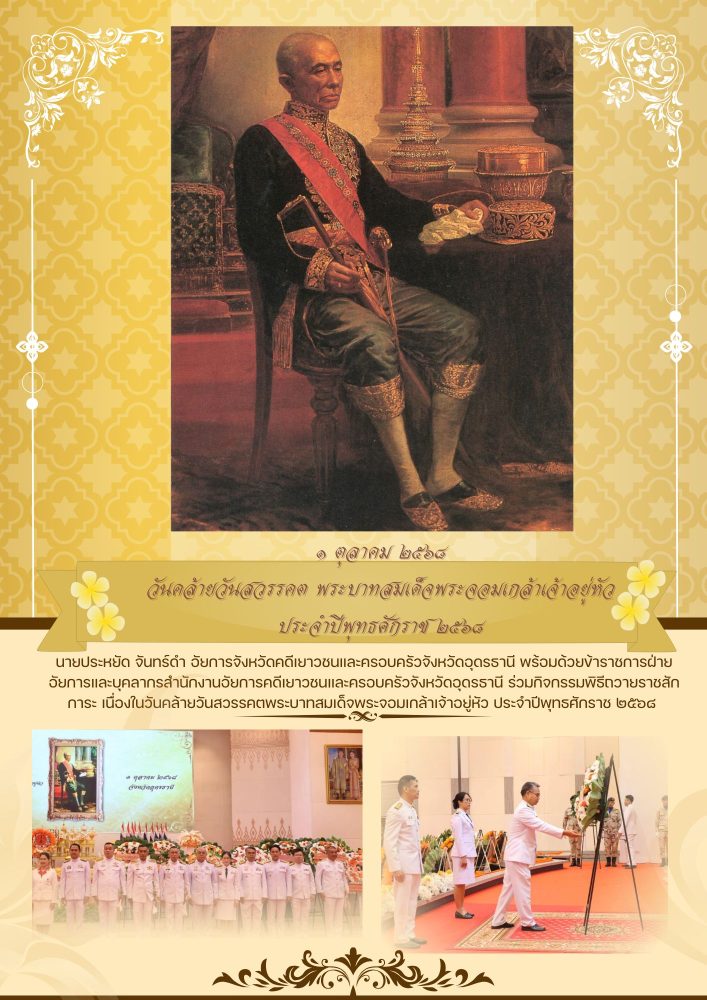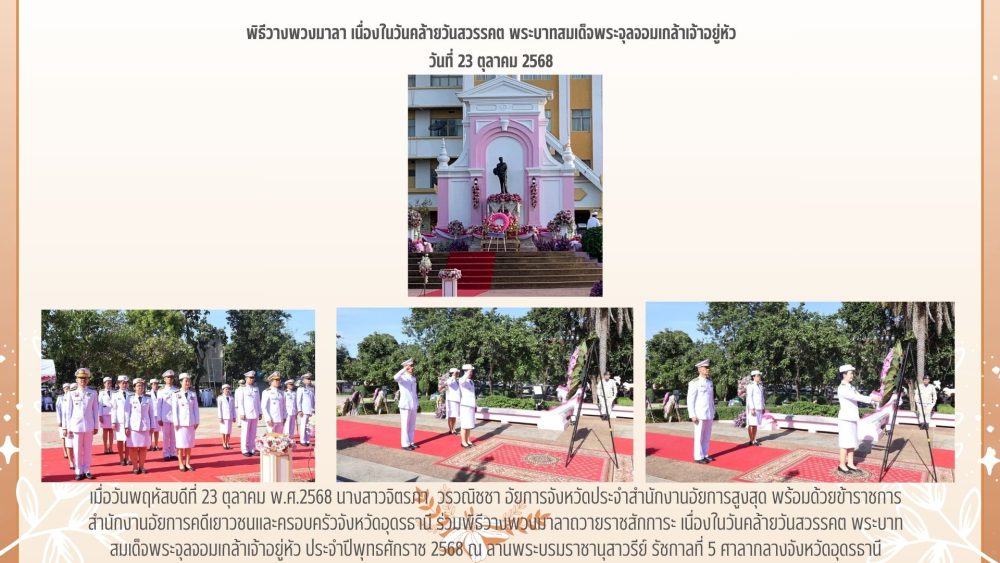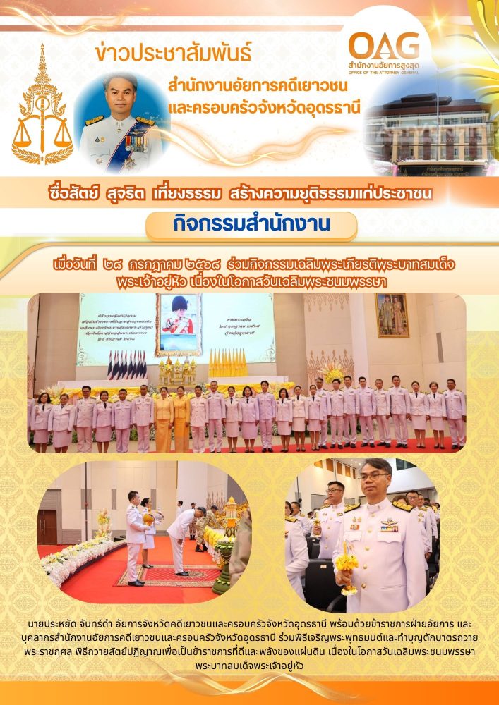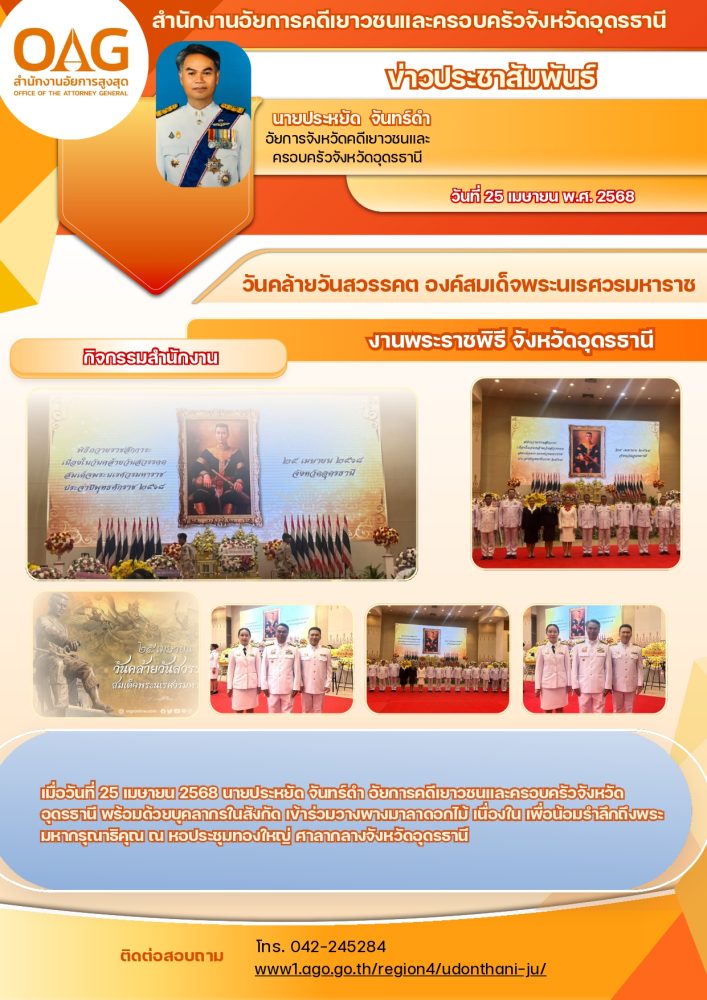>>>> วันที่ 6 เมษายน 2568 นายประหยัด จันทร์ดำ อัยการจังหวัดคดีเยาวชนและครอบครัวจังหวัดอุดรธานี พร้อมด้วยข้าราชการฝ่ายอัยการ เข้าร่วมพิธีถวายราชสักการะเนื่องในวันที่ระลึกพระบาทสมเด็จพระพุทธยอดฟ้าจุฬาโลกมหาราช และวันที่ระลึกมหาจักรีบรมราชวงศ์ ประจำปีพุทธศักราช 2568 ณ หอประชุมทองใหญ่ ศาลากลางจังหวัดอุดรธานี อำเภอเมืองอุดรธานี จังหวัดอุดรธานี เพื่อน้อมรำลึกถึงพระมหากรุณาธิคุณ