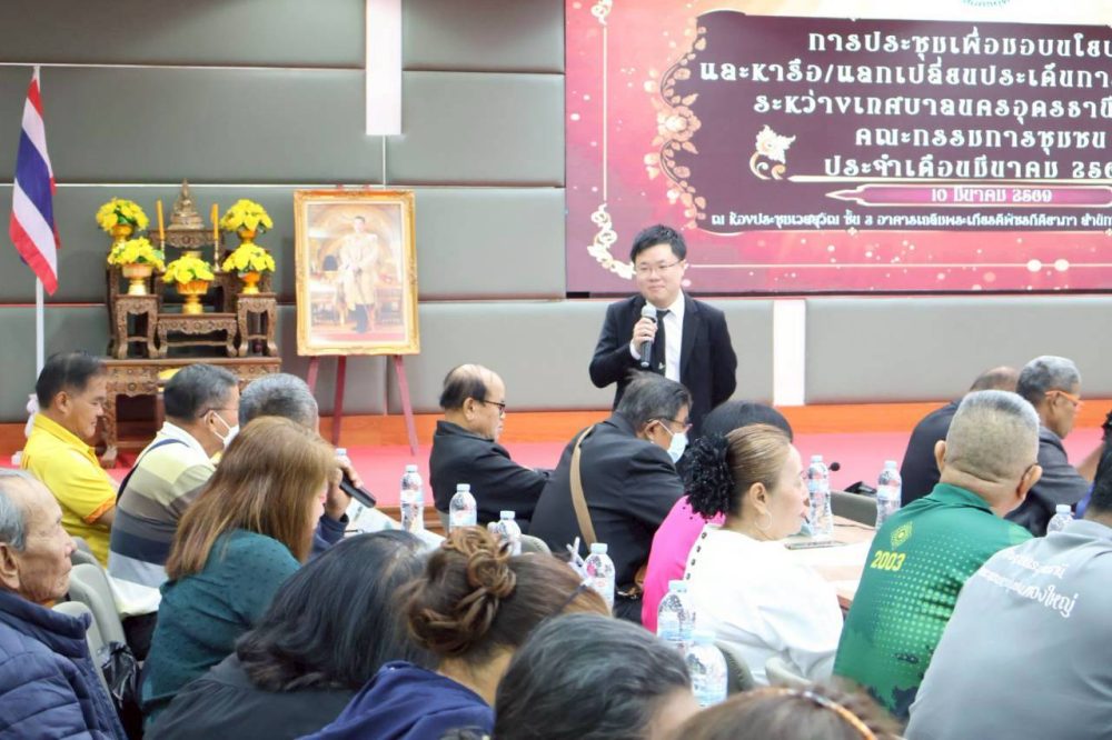 เมื่อวันอังคารที่ 10 มีนาคม 2569 นายชาญชัย อังกูรวิวัฒน์ รองอัยการจังหวัดคุ้มครองสิทธิและช่วยเหลือทางกฎหมายและการบังคับคดีจังหวัดอุดรธานี เป็นวิทยากรบรรยายกฎหมาย การประชุมเพื่อรับมอบนโยบาย และหารือ/แลกเปลี่ยน ประเด็นการปฏิบัติงานระหว่างเทศบาลนครอุดรธานีร่วมกับคณะกรรมการชุมชน ประจำเดือนมีนาคม 2569 ณ ห้องประชุมเวสสุวัณ ชั้น 3 อาคารเฉลิมพระเกียรติพัชรกิติยาภา สำนักงานเทศบาลนครอุดรธานี ตำบลหมากแข้ง อำเภอเมืองอุดรธานี จังหวัดอุดรธานี