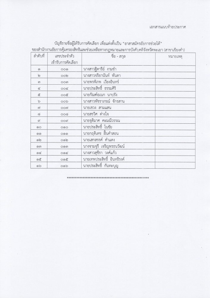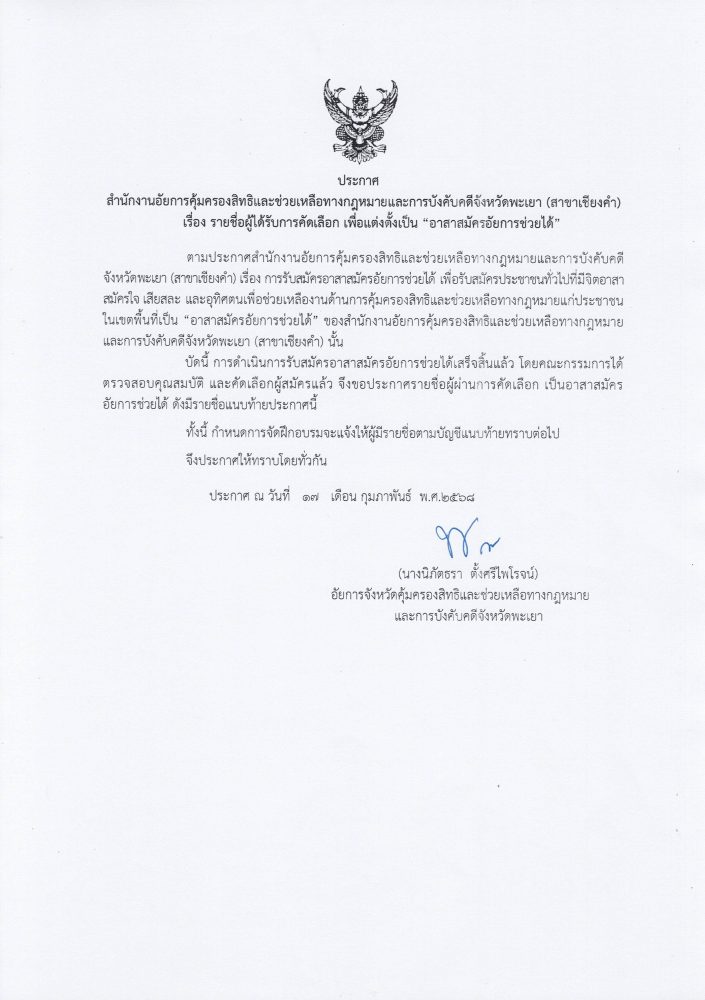 ทนายความอาสาประจำสำนักงานอัยการคุ้มครองสิทธิและช่วยเหลือทางกฎหมายและการบังคับคดีจังหวัดพะเยา(สาขาเชียงคำ)
