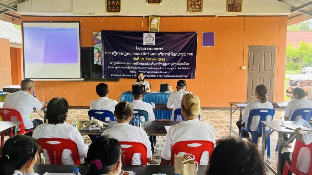 เมื่อวันที่ 29 สิงหาคม 2568 เวลา 14.00 นาฬิกา ท่านอัญชลี ลีอัจฉริยกุล รองอัยการจังหวัด ได้รับเชิญเป็นวิทยากรบรรยายความรู้ทางกฎหมายและสิทธิและเสรีภาพให้แก่ประชาชน ณ ศูนย์พัฒนาคุณภาพชีวิตและส่งเสริมอาชีพผู้สูงอายุตำบลทุ่งกล้วย จัดโดย ศูนย์ไกล่เกลี่ยข้อพิพาทภาคประชาชนตำบลทุ่งกล้วย อำเภอภูซาง จังหวัดพะเยา ร่วมกับ สำนักงานยุติธรรมจังหวัดพะเยา เพื่อให้ความรู้กับผู้สูงอายุตำบลทุ่งกล้วย จำนวน 80 คน
