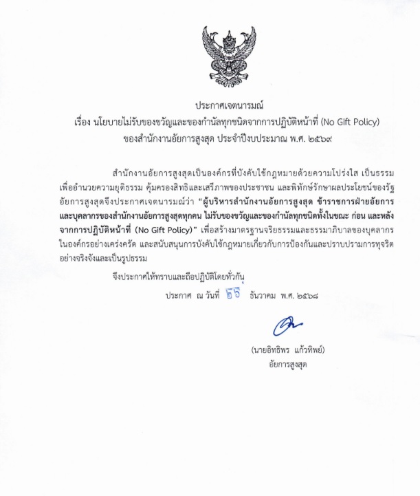 เรื่อง ไม่รับของขวัญและของกำนัลทุกชนิดจากการปฏิบัติหน้าที่ (No Gift Policy)