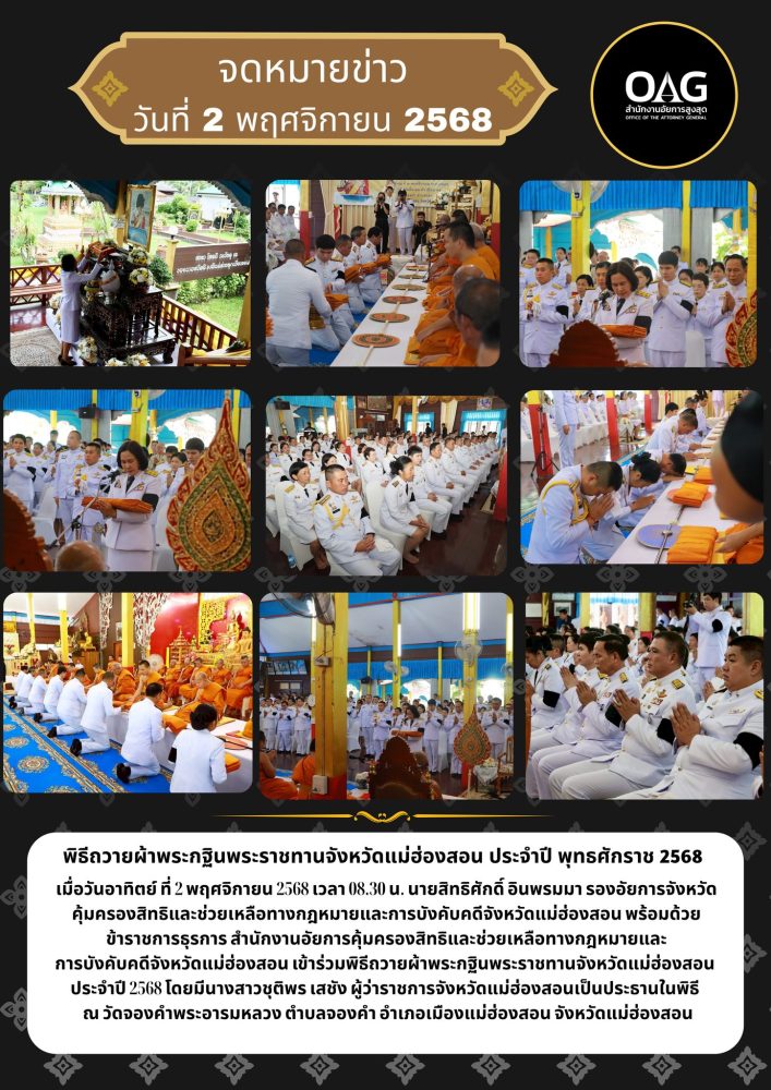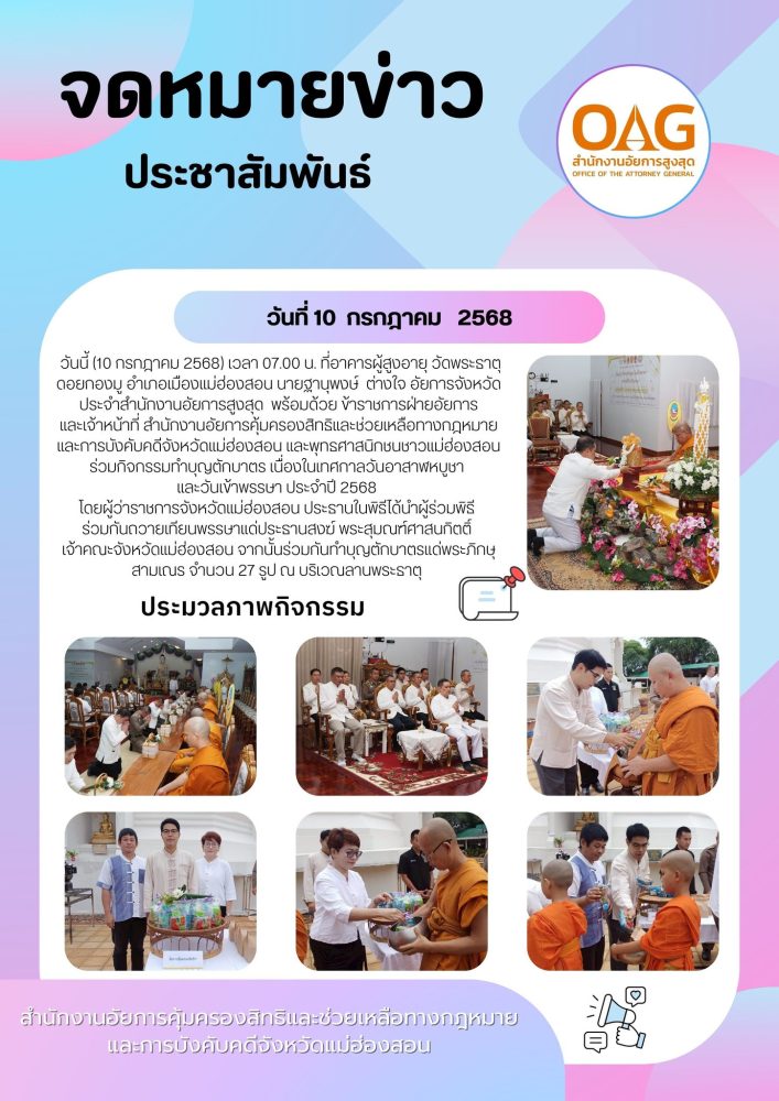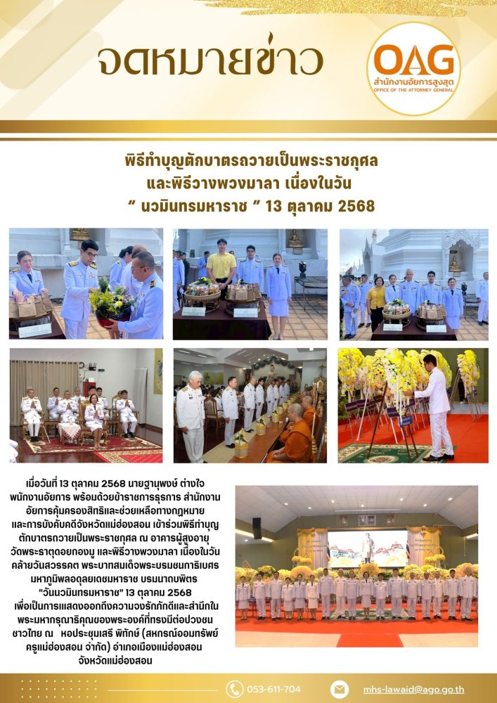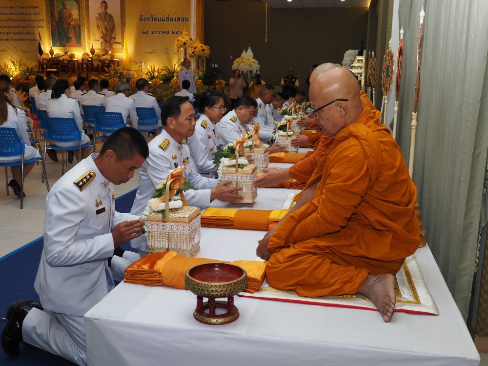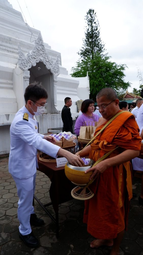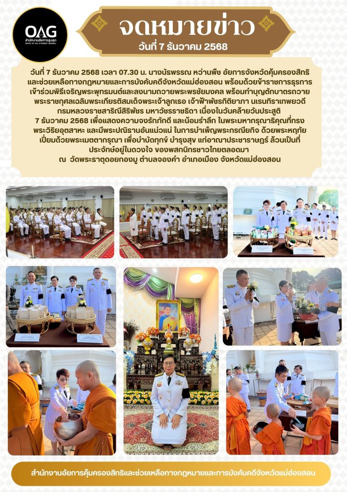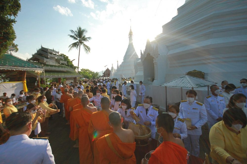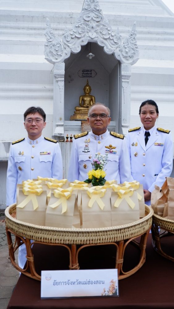 เวลา 07.00 นาฬิกา นายกรกฏ กลั่นกลิ่น อัยการจังหวัดประจำสำนักงานอัยการสูงสุด สำนักงานอัยการคุ้มครองสิทธิฯจังหวัดแม่ฮ่องสอน ร่วมพิธีทำบุญตักบาตรถวายเป็นพระราชกุศล พระสงฆ์จำนวน 89 รูป ณ บริเวณลานพระธาตุเจดีย์ วัดพระธาตุดอยกองมู