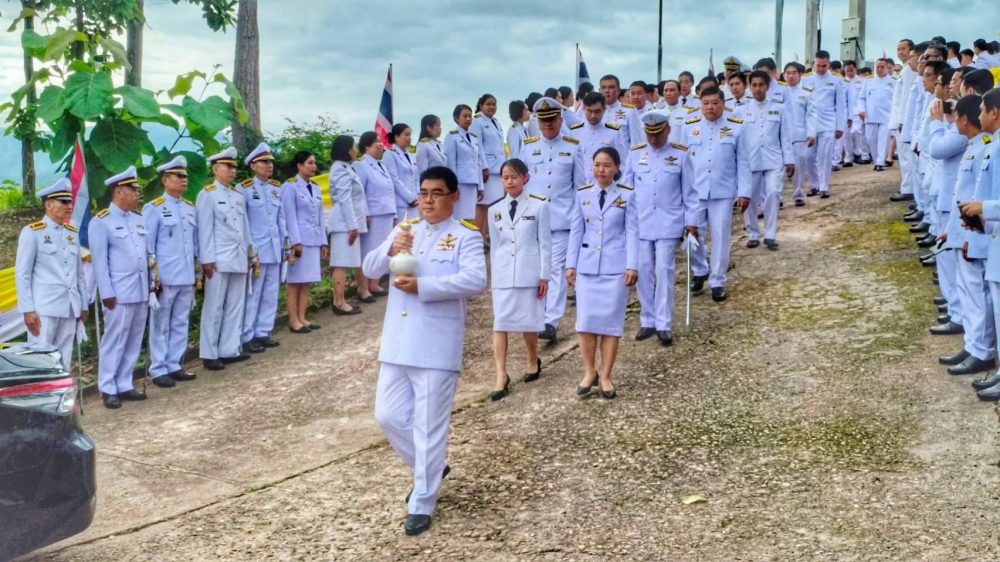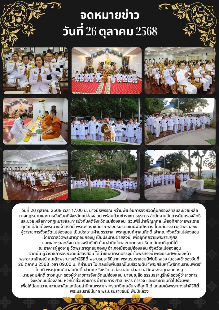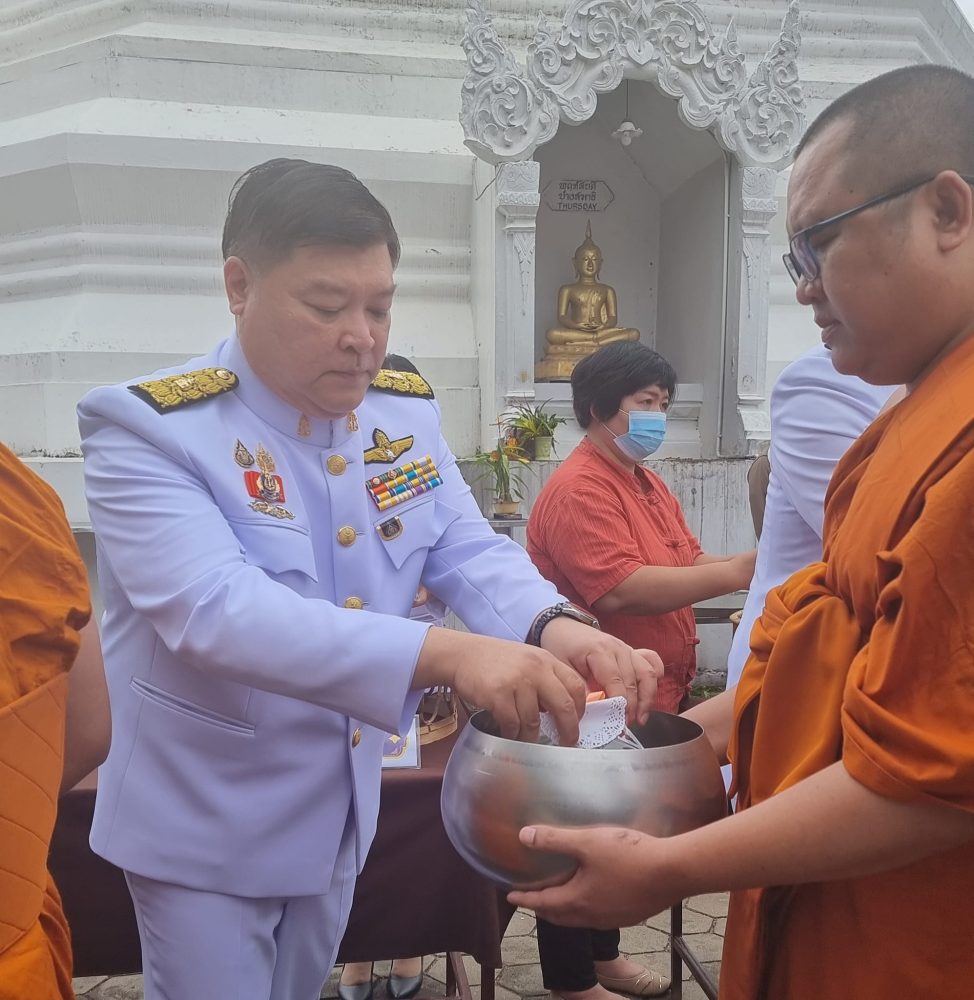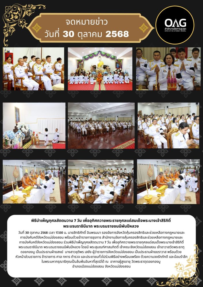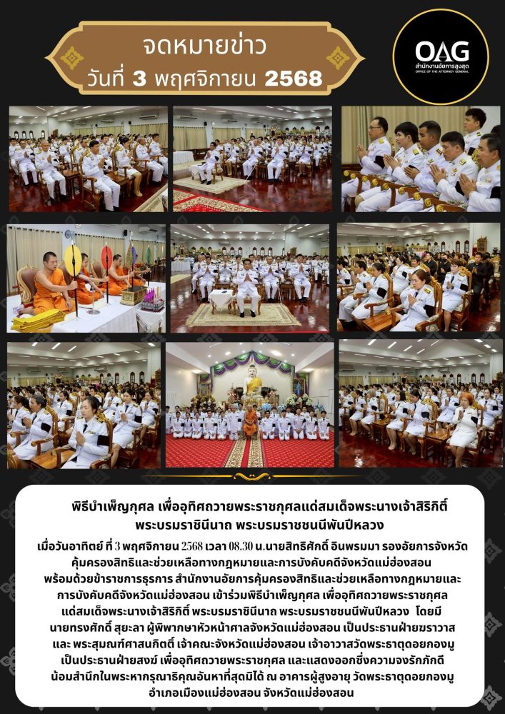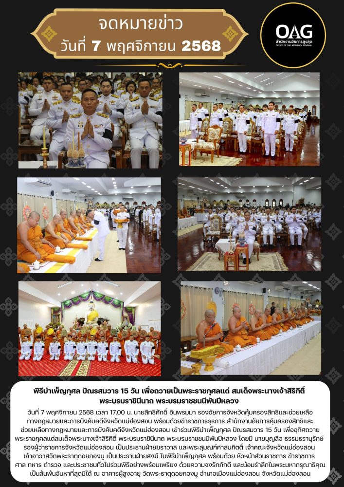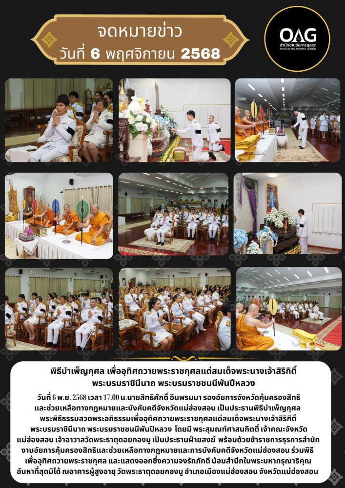 เวลา 07.00 นาฬิกา นายกรกฏ กลั่นกลิ่น อัยการจังหวัดประจำสำนักงานอัยการสูงสุด สำนักงานอัยการคุ้มครองสิทธิฯจังหวัดแม่ฮ่องสอน ร่วมพิธีทำบุญตักบาตรถวายเป็นพระราชกุศล พระสงฆ์จำนวน 89 รูป ณ บริเวณลานพระธาตุเจดีย์ วัดพระธาตุดอยกองมู