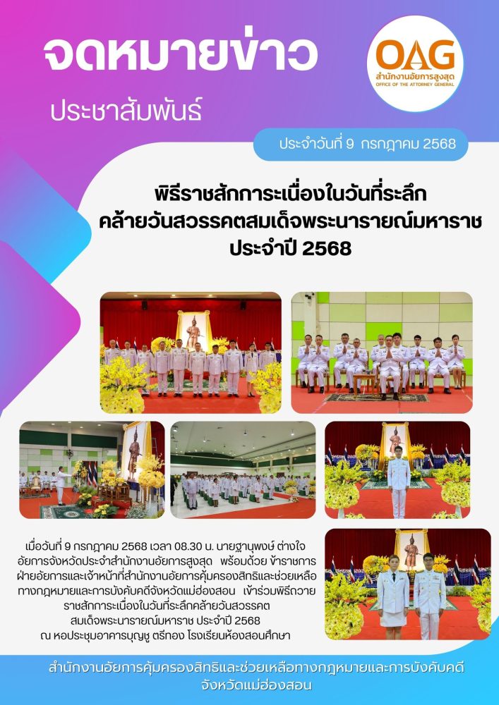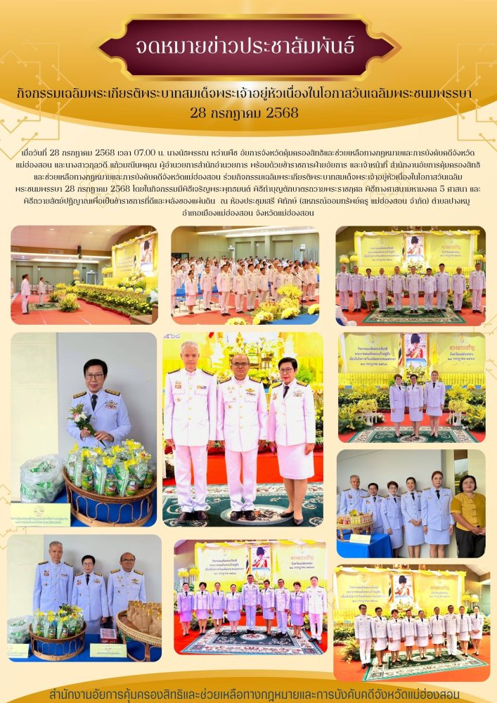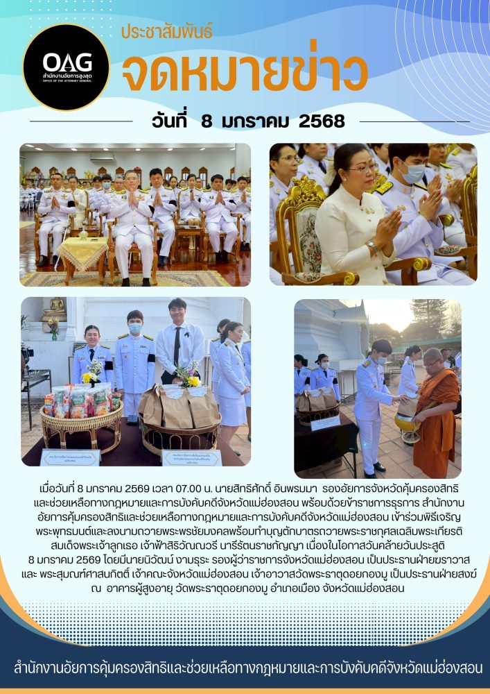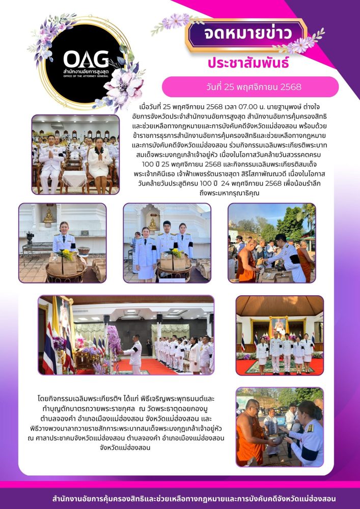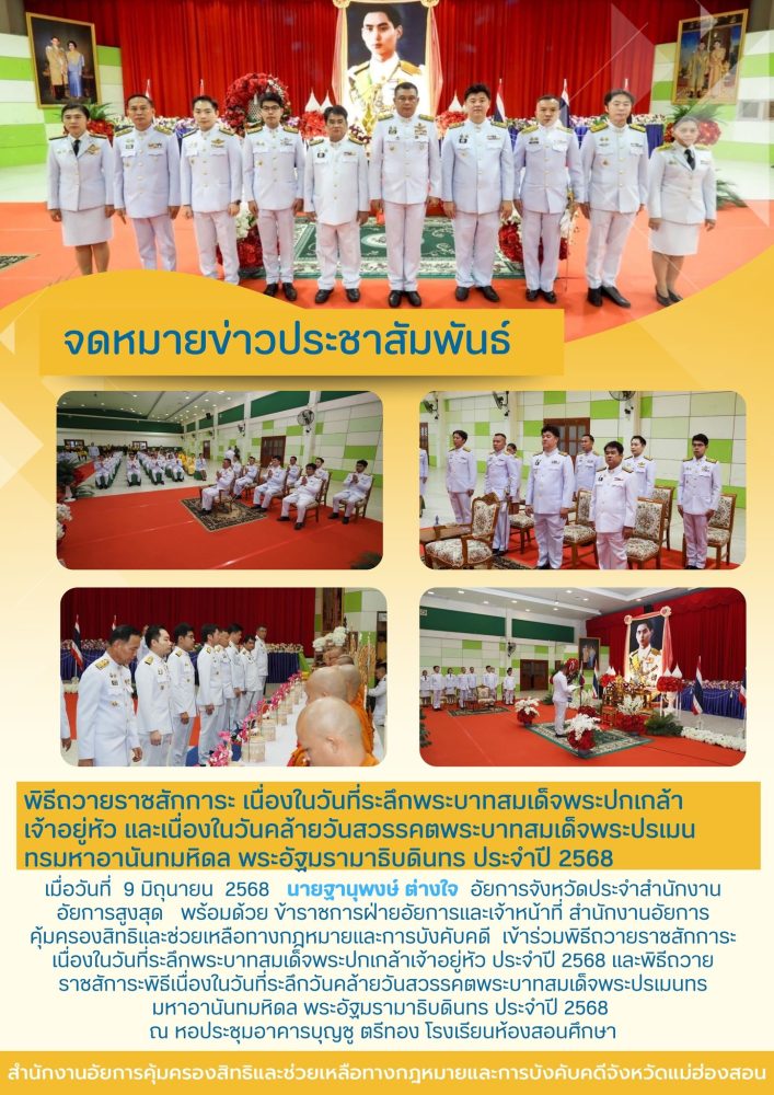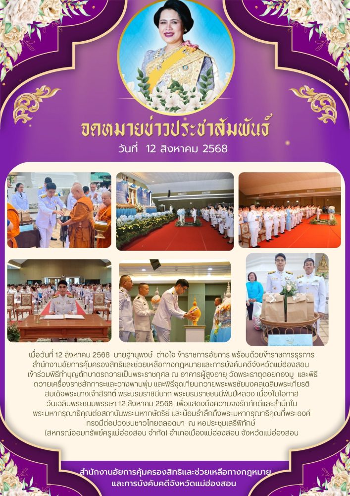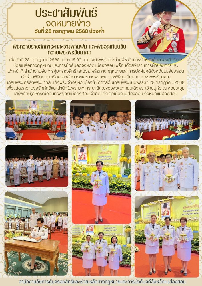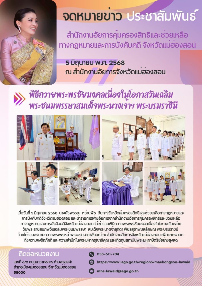 วันที่ ๒ เมษายน ๒๕๖๘ เวลา ๐๗.๐๐ น. สำนักงานอัยการคุ้มครองสิทธิและช่วยเหลือทางกฎหมายและการบังคับคดี จังหวัดแม่ฮ่องสอน ร่วมกิจกรรมเฉลิมพระเกียรติ สมเด็จพระกนิษฐาธิราชเจ้า กรมสมเด็จพระเทพรัตนราชสุดาฯ สยามบรมราชกุมารี เนื่องในวันคล้ายวันพระราชสมภพ