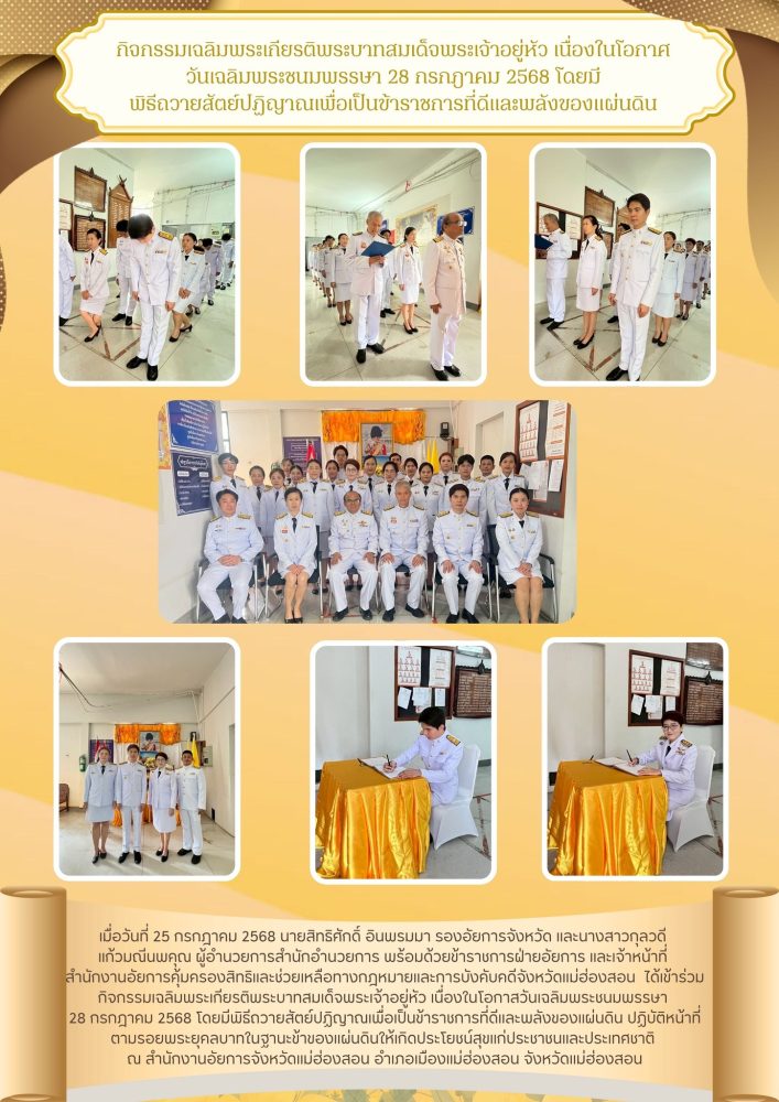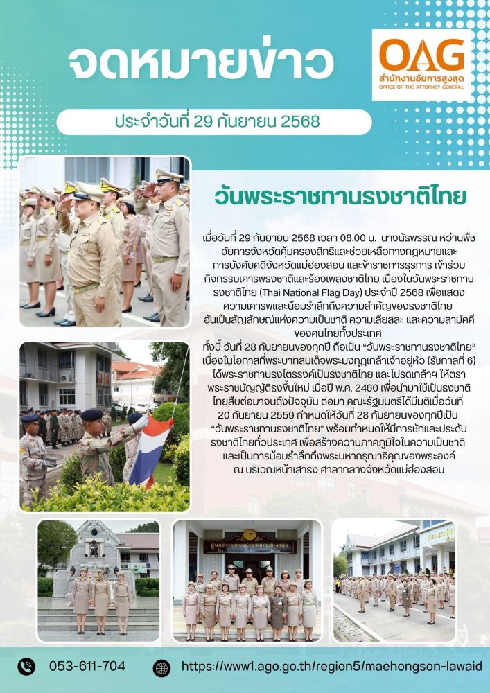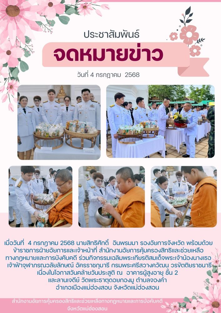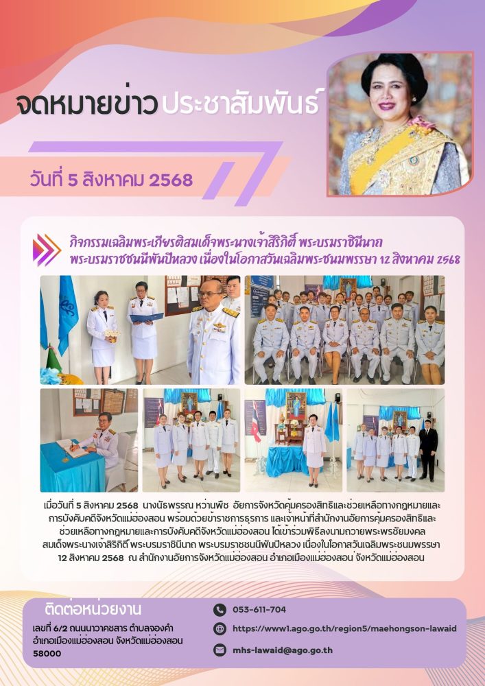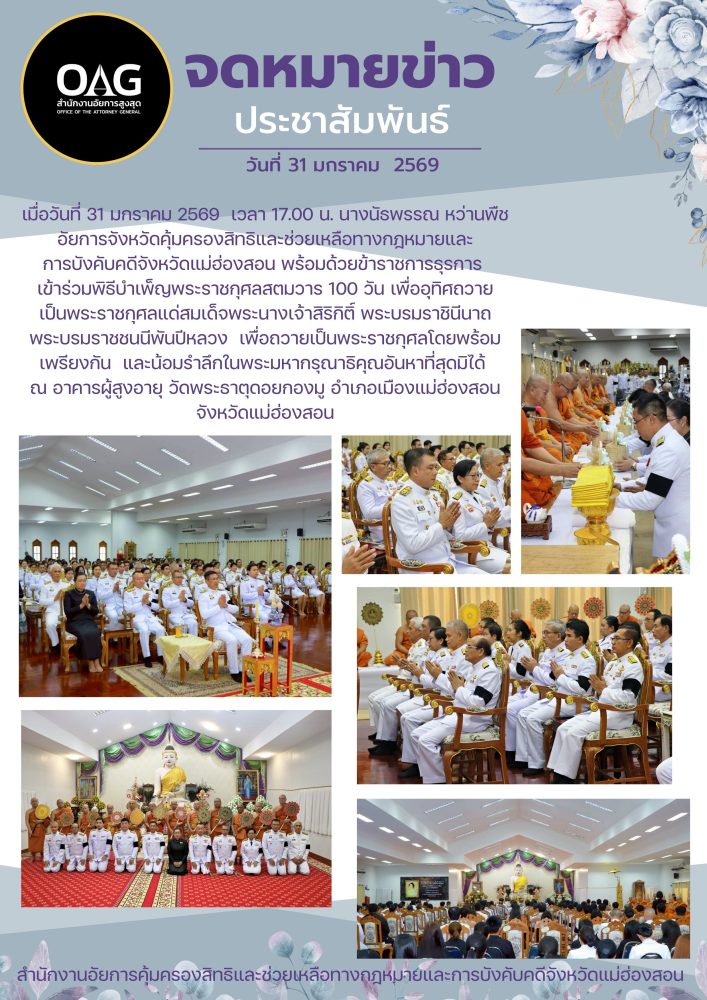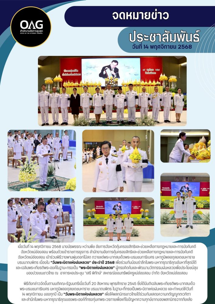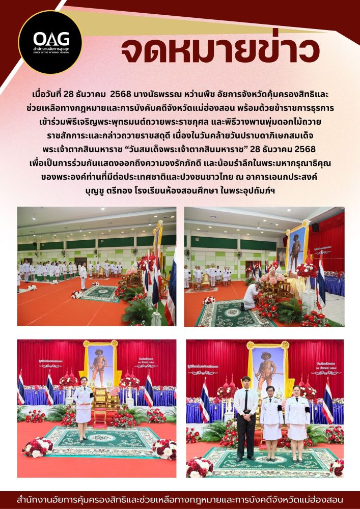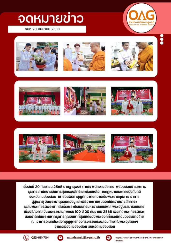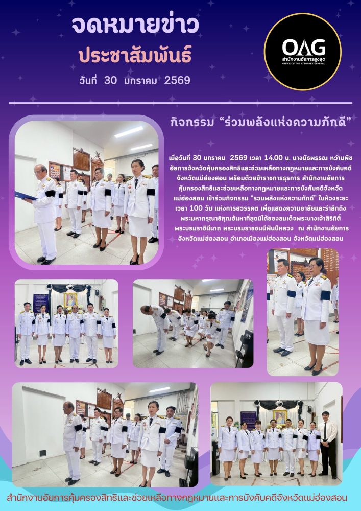 วันที่ ๒ เมษายน ๒๕๖๘ เวลา ๐๗.๐๐ น. สำนักงานอัยการคุ้มครองสิทธิและช่วยเหลือทางกฎหมายและการบังคับคดี จังหวัดแม่ฮ่องสอน ร่วมกิจกรรมเฉลิมพระเกียรติ สมเด็จพระกนิษฐาธิราชเจ้า กรมสมเด็จพระเทพรัตนราชสุดาฯ สยามบรมราชกุมารี เนื่องในวันคล้ายวันพระราชสมภพ