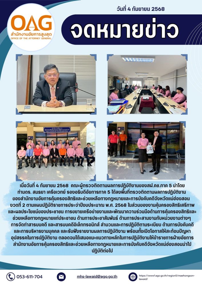 เดินทางตรวจราชการและนิเทศงาน สำนักงานอัยการภาค ๕ ครั้งที่ ๑ ประจำปีงบประมาณ พ.ศ. ๒๕๖๘ (รอบที่ ๓) จังหวัดแม่ฮ่องสอน