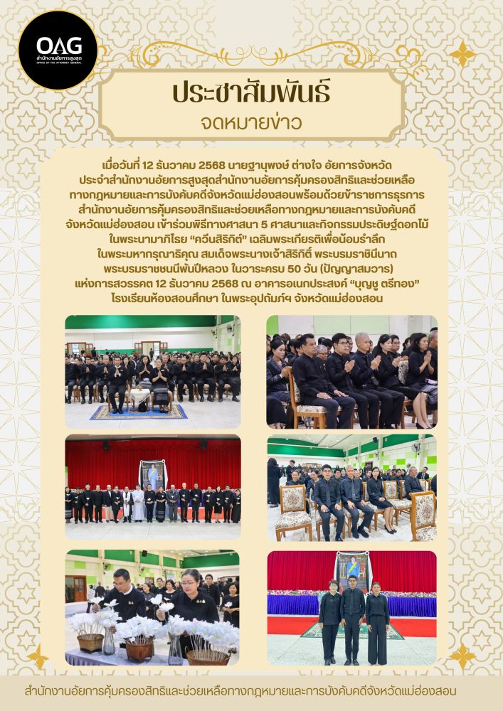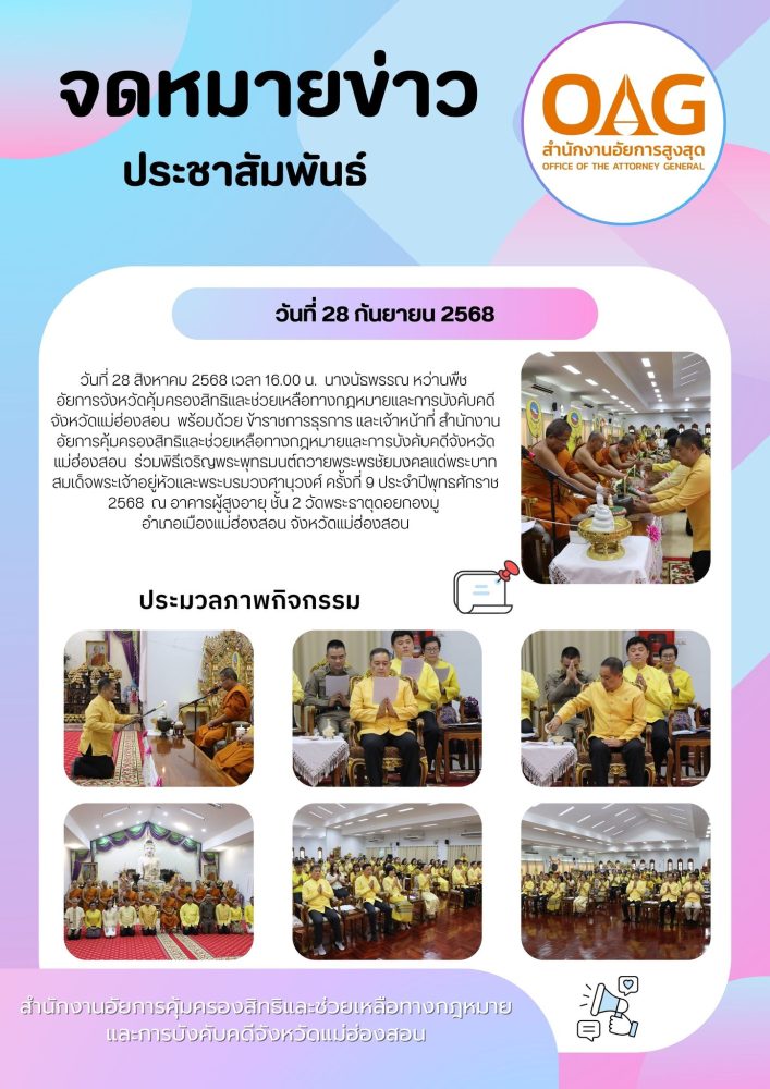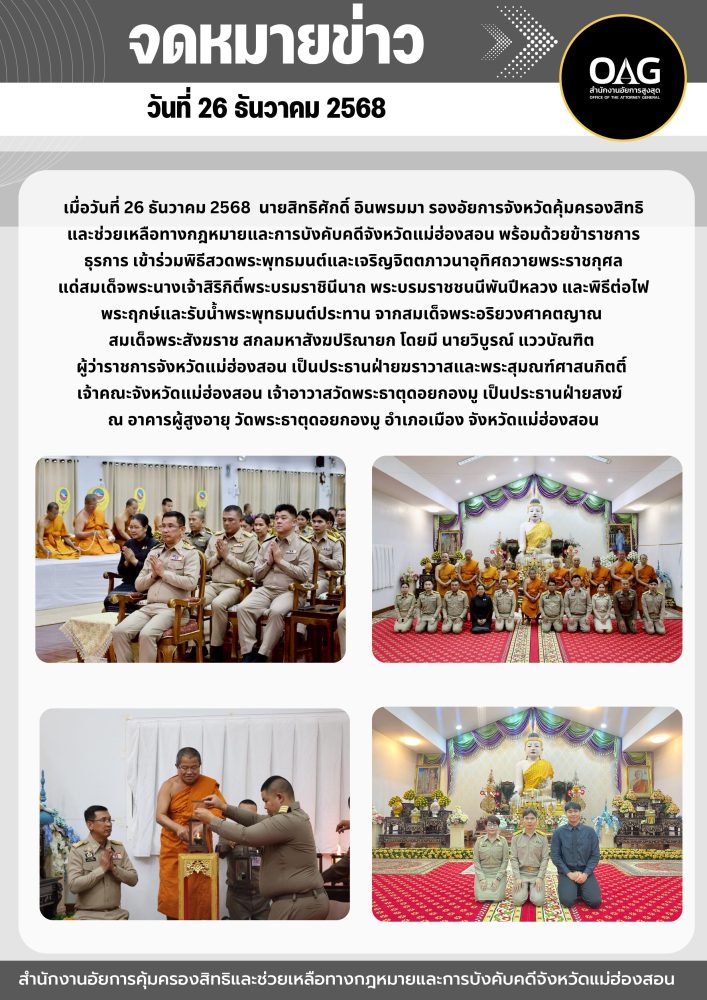 วันที่ ๒๘ มกราคม ๒๕๖๘ เวลา ๑๖.๐๐ น. ที่ อาคารผู้สูงอายุ วัดพระธาตุดอยกองมู ตำบลจองคำ อำเภอเมืองแม่ฮ่องสอน จังหวัดแม่ฮ่องสอน นายกษิดิ์เดช เรืองสว่าง อัยการจังหวัดคุ้มครองสิทธิและช่วยเหลือทางกฎหมายและการบังคับคดีจังหวัดแม่ฮ่องสอน พร้อมด้วยบุคลากรสำนักงานอัยการคุ้มครองสิทธิและช่วยเหลือทางกฎหมายและการบังคับคดีจังหวัดแม่ฮ่องสอน