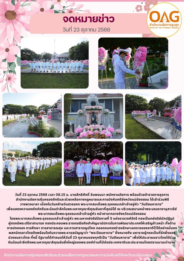 เวลา 07.00 น. นางสาวปิยาพร จุ๊สกุล รองอัยการจังหวัด พร้อมด้วยข้าราชการธุรการ และเจ้าหน้าที่ สำนักงานอัยการคุ้มครองสิทธิฯจังหวัดแม่ฮ่องสอน เข้าร่วมพิธีวางพวงมาลาน้อมรำลึกเนื่องในวันคล้ายวันสวรรคต พระบาทสมเด็จพระจุลจอมเกล้าเจ้าอยู่หัว 23 ตุลาคม 2565 ณ พระบรมราชานุสาวรีย์ พระบาทสมเด็จพระจุลจอมเกล้าเจ้าอยู่หัว ศาลากลางจังหวัดแม่ฮ่องสอน อำเภอเมืองแม่ฮ่องสอน จังหวัดแม่ฮ่องสอน