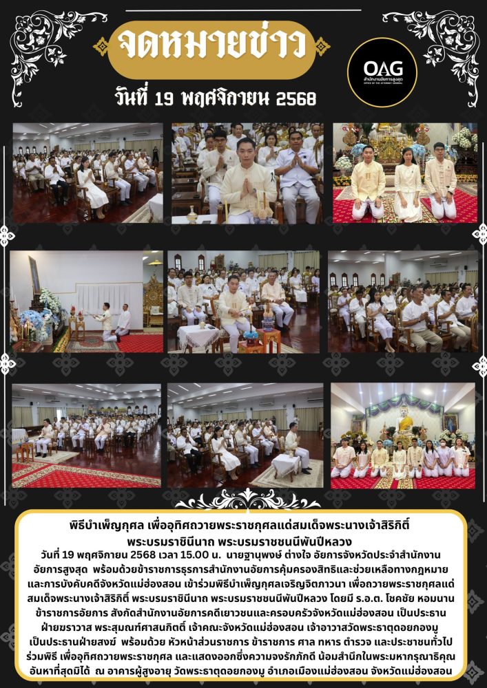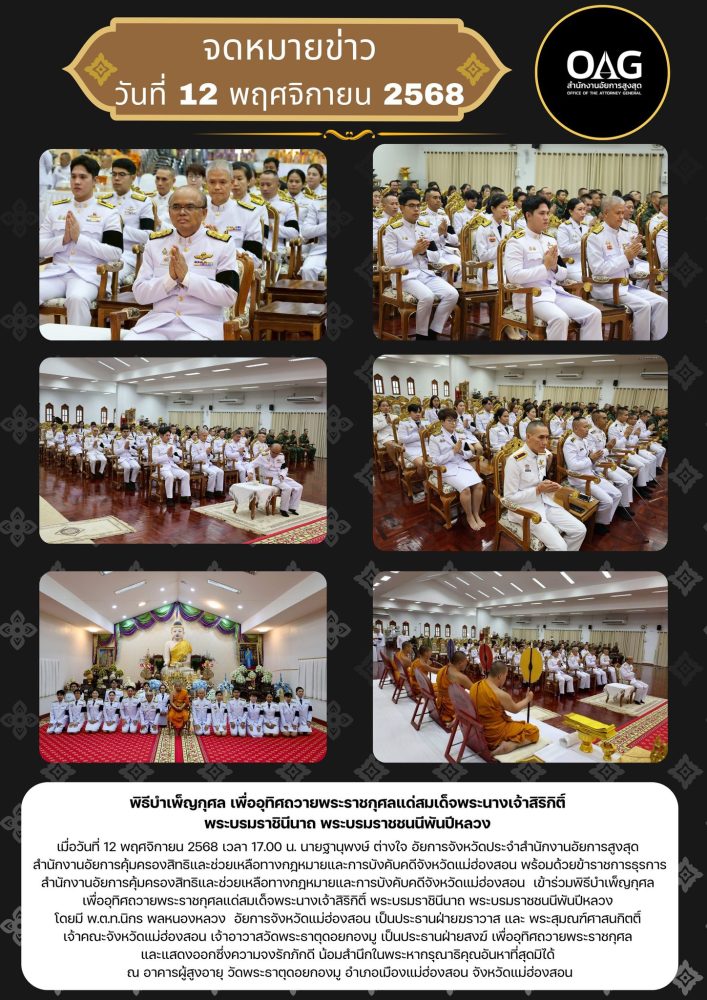 วันพฤหัสบดีที่ ๑ ธันวาคม ๒๕๖๕ เวลา ๑๐.๐๐ น. นางสาวเพ็ญนิภา คุ้มได้อยู่ อัยการจังหวัดสำนักงานอัยการคุ้มครองสิทธิฯจังหวัดแม่ฮ่องสอน เข้าร่วม พิธีทำบุญและฟังเทศน์บทพระธรรมเทศนาเฉลิมพระธรรมบารมี ใน “อุภินนมัตถจรกถา” เฉลิมพระบารมีสมเด็จพระนางเจ้าสิริกิติ์ พระบรมราชินีนาถ พระบรมราชชนนีพันปีหลวง เนื่องในโอกาสมหามงคลเฉลิมพระชนมพรรษา ๙๐ พรรษา ๑๒ สิงหาคม ๒๕๖๕ ณ อาคารผู้สูงอายุ ชั้น ๒ วัดพระธาตุดอยกองมู ตำบลจองคำ อำเภอเมืองแม่ฮ่องสอน จังหวัดแม่ฮ่องสอน