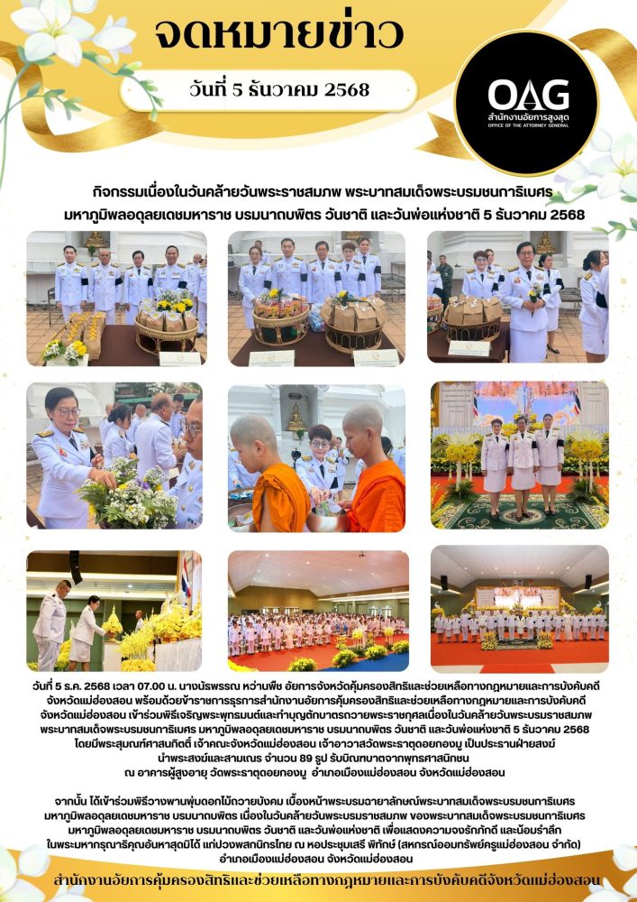 วันจันทร์ที่ ๕ ธันวาคม ๒๕๖๕ เวลา ๐๗.๐๐ น. นางสาวเพ็ญนิภา คุ้มได้อยู่ อัยการจังหวัดสำนักงานอัยการคุ้มครองสิทธิฯจังหวัดแม่ฮ่องสอน พร้อมด้วยข้าราชการธุรการ สำนักงานอัยการคุ้มครองสิทธิฯจังหวัดแม่ฮ่องสอน เข้าร่วม กิจกรรมทำบุญตักบาตร พิธีเจริญพระพุทธมนต์ ถวายเป็นพระราชกุศล เนื่องในวันคล้ายวันพระบรมราชสมภพ พระบาทสมเด็จพระบรมชนกาธิเบศร มหาภูมิพลอดุลยเดชมหาราช บรมนาถบพิตร วันชาติ และวันพ่อแห่งชาติ พุทธศักราช ๒๕๖๕ ณ วัดพระธาตุดอยกองมู ตำบลจองคำ อำเภอเมืองแม่ฮ่องสอน จังหวัดแม่ฮ่องสอน