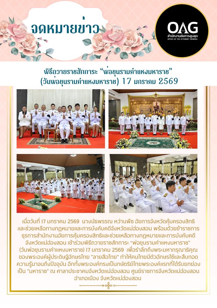 เวลา 18.00 น. นางสาวเพ็ญนิภา คุ้มได้อยู่ อัยการจังหวัดสำนักงานอัยการคุ้มครองสิทธิฯจังหวัดแม่ฮ่องสอน เข้าร่วมพิธีวางพวงมาลา ณ ห้องประชุมเสรี พิทักษ์ (สหกรณ์ออมทรัพย์ครูแม่ฮ่องสอน จำกัด) อำเภอเมืองแม่ฮ่องสอน จังหวัดแม่ฮ่องสอน