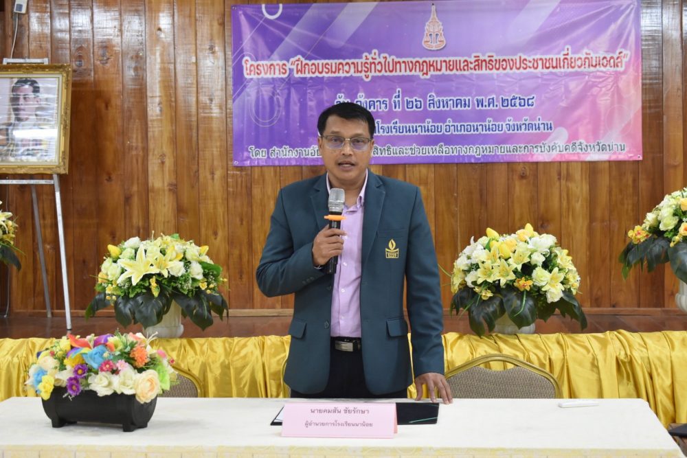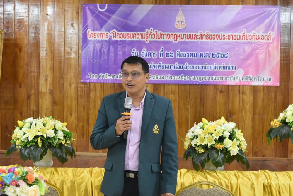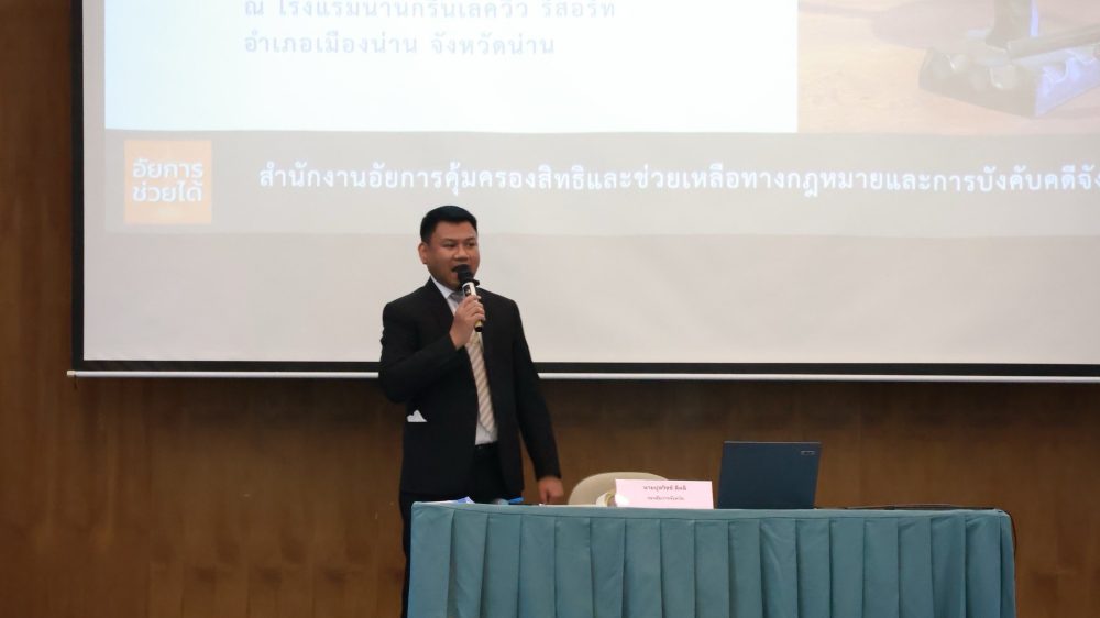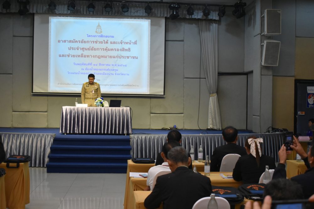 ประจำปีงบประมาณ พ.ศ. 2568” ณ ห้องน้ำทองแกรนด์บอลรูม โรงแรมน้ำทองน่าน อำเภอเมืองน่าน จังหวัดน่าน ในการนี้ ได้รับเกียรติจาก นายชัยนรงค์ วงศ์ใหญ่ ผู้ว่าราชการจังหวัดน่าน เป็นประธานในพิธีเปิดโครงการดังกล่าว โครงการฝึกอบรมอาสาสมัครอัยการช่วยได้และเจ้าหน้าที่ประจำศูนย์อัยการคุ้มครองสิทธิและช่วยเหลือทางกฎหมายแก่ประชาชนประจำปีงบประมาณ 2568 ตามแผนปฏิบัติการของสำนักงานอัยการสูงสุด กำหนดให้สำนักงานคุ้มครองสิทธิและช่วยเหลือทางกฎหมายแก่ประชาชน ดำเนินโครงการอาสาสมัคร