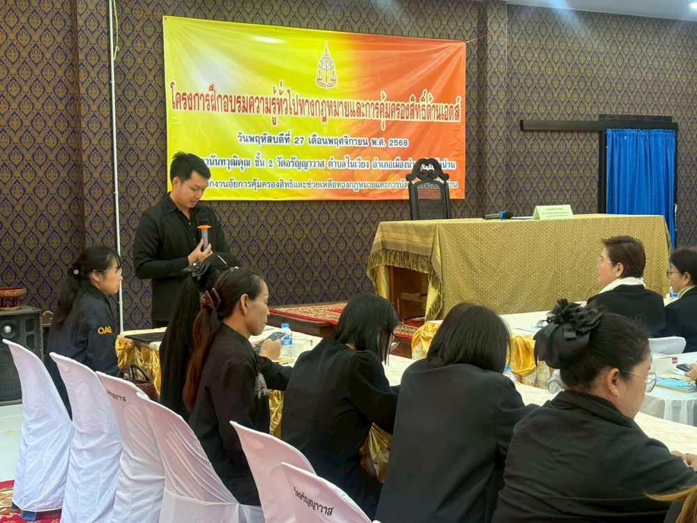 ณ ศาลานันทวุฒิคุณ ชั้น 1 วัดอรัญญาวาส ตำบลในเวียง อำเภอเมืองน่าน จังหวัดน่าน ตามแผนปฏิบัติการประจำปีงบประมาณ พ.ศ. 2569 สำนักงานอัยการคุ้มครองสิทธิและช่วยเหลือทางกฎหมายและการบังคับคดีจังหวัดน่าน ได้กำหนดจัดโครงการฝึกอบรม