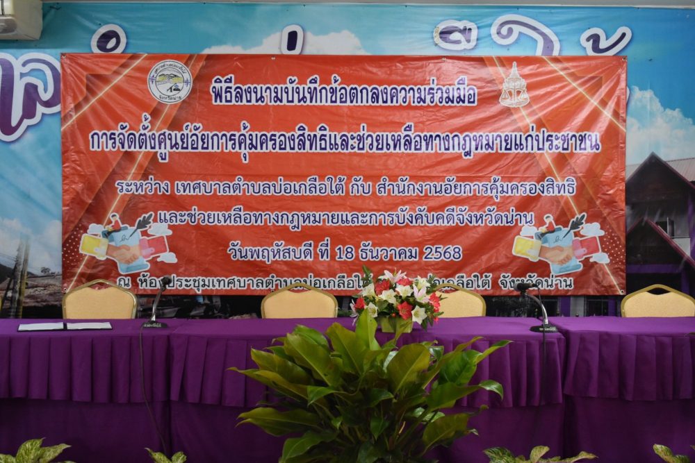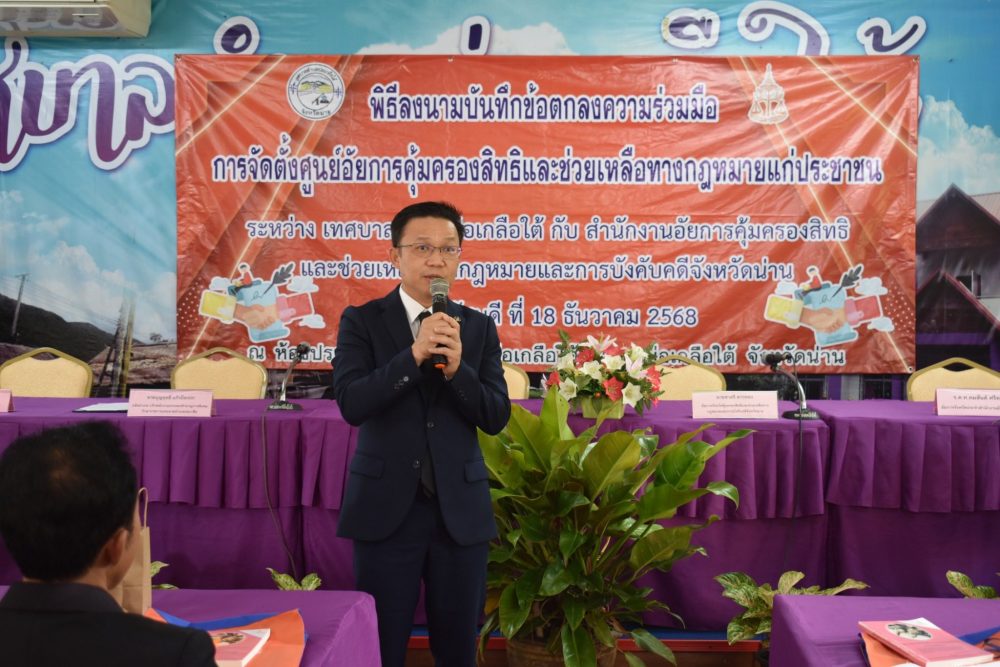 วันที่ 18 ธันวาคม 2568 สำนักงานอัยการคุ้มครองสิทธิและช่วยเหลือทางกฎหมายและการบังคับคดีจังหวัดน่าน ร่วมกับ สำนักงานเทศบาลตำบลบ่อเกลือใต้ ร่วมจัดพิธีลงนามบันทึกข้อตกลงความร่วมมือ “จัดตั้งศูนย์อัยการคุ้มครองสิทธิและช่วยเหลือทางกฎหมาย