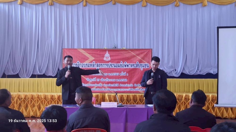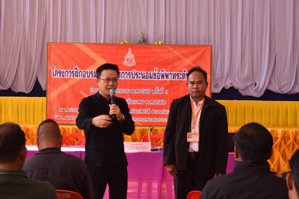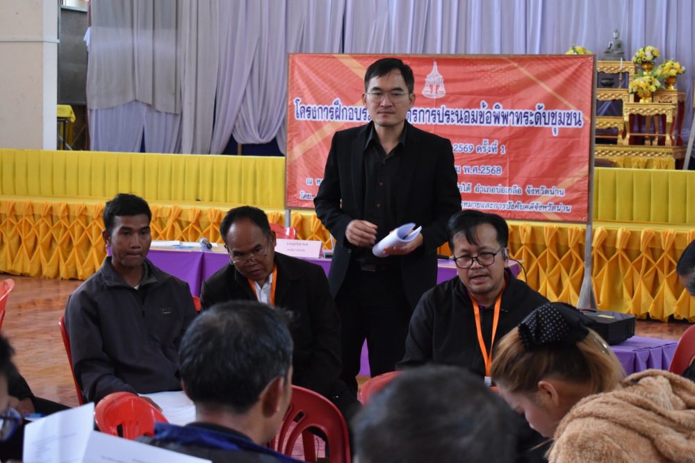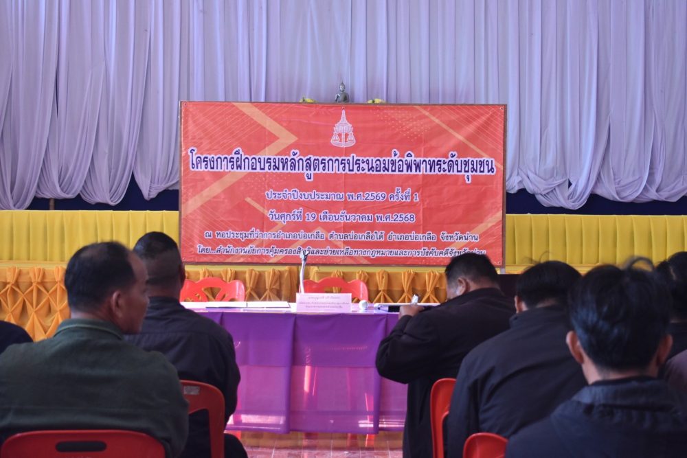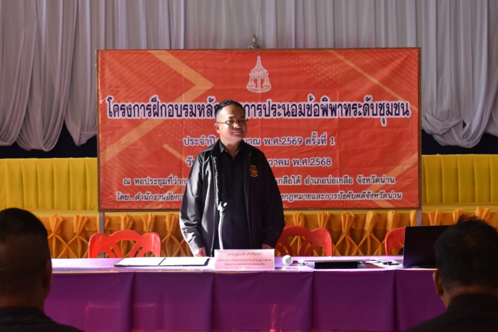 วันที่ 19 ธันวาคม 2568 สำนักงานอัยการคุ้มครองสิทธิและช่วยเหลือทางกฎหมายและการบังคับคดีจังหวัดน่าน ได้จัดโครงการฝึกอบรมหลักสูตรประนอมข้อพิพาทระดับชุมชนให้แก่ กำนัน ผู้ใหญ่บ้าน คณะกรรมการหมู่บ้าน ผู้นำกลุ่มต่างๆ อาสาสมัครอัยการช่วยได้