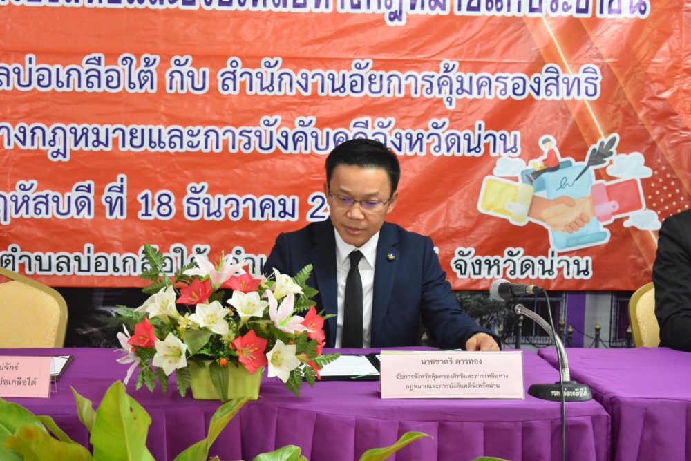 ในพื้นที่อำเภอบ่อเกลือ และเจ้าหน้าที่ประจำศูนย์อัยการคุ้มครองสิทธิและช่วยเหลือทางกฎหมายแก่ประชาชนเทศบาลบ่อเกลือใต้ ณ หอประชุมที่ว่าการอำเภอบ่อเกลือ อำเภอบ่อเกลือ จังหวัดน่าน