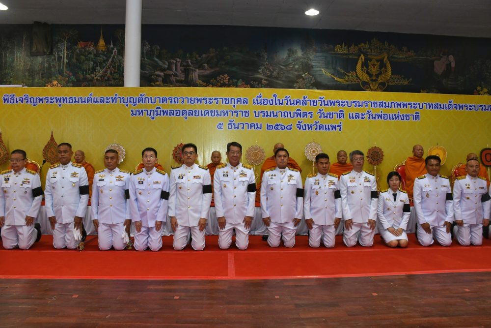 5 ธ.ค. 2568 ท่านฉลวย กาญจนไตรภพ อัยการจังหวัดประจำสำนักงานอัยการสูงสุด สำนักงานอัยการคุ้มครองสิทธิและช่วยเหลือทางกฎหมายและการบังคับคดีจังหวัดแพร่ พร้อมบุคลากร เข้าร่วมประกอบพิธีเจริญพระพุทธมนต์ ทำบุญตักบาตร และพิธีวางพานพุ่มดอกไม้ถวายราชสักการะ เพื่อถวายพระราชกุศล เนื่องในวันคล้ายวันพระบรมราชสมภพ พระบาทสมเด็จพระบรมชนกาธิเบศร มหาภูมิพลอดุลยเดชมหาราช บรมนาถบพิตร ตรงกับวันชาติ และวันพ่อแห่งชาติ 5 ธันวาคม 2568 ณ ศูนย์ประชุมและแสดงศิลปวัฒนธรรมล้านนาตะวันออก และกลุ่มประเทศ GMS ตำบลทุ่งโฮ้ง อำเภอเมืองแพร่ จังหวัดแพร่