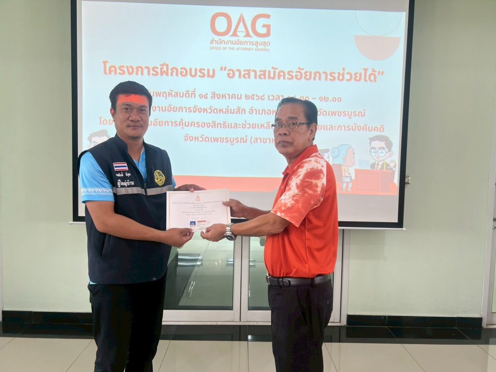 สำนักงานอัยการจังหวัดคุ้มครองสิทธิและช่วยเหลือทางกฎหมายและการบังคับคดีจังหวัดเพชรบูรณ์ (สาขาหล่มสัก) ได้จัดโครงการฝึกอบรม “อาสาสมัครอัยการช่วยได้ ” รุ่นที่ 1 ในวันที่ 14 สิงหาคม 2568 ณ ห้องประชุมสำนักงานอัยการจังหวัดหล่มสัก ชั้น 2 อาคารสำนักงานอัยการจังหวัดหล่มสัก