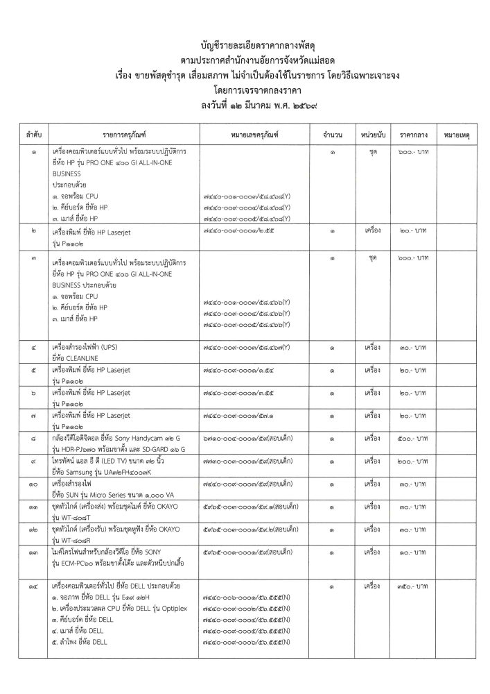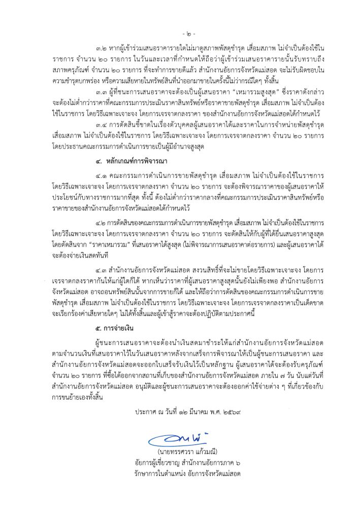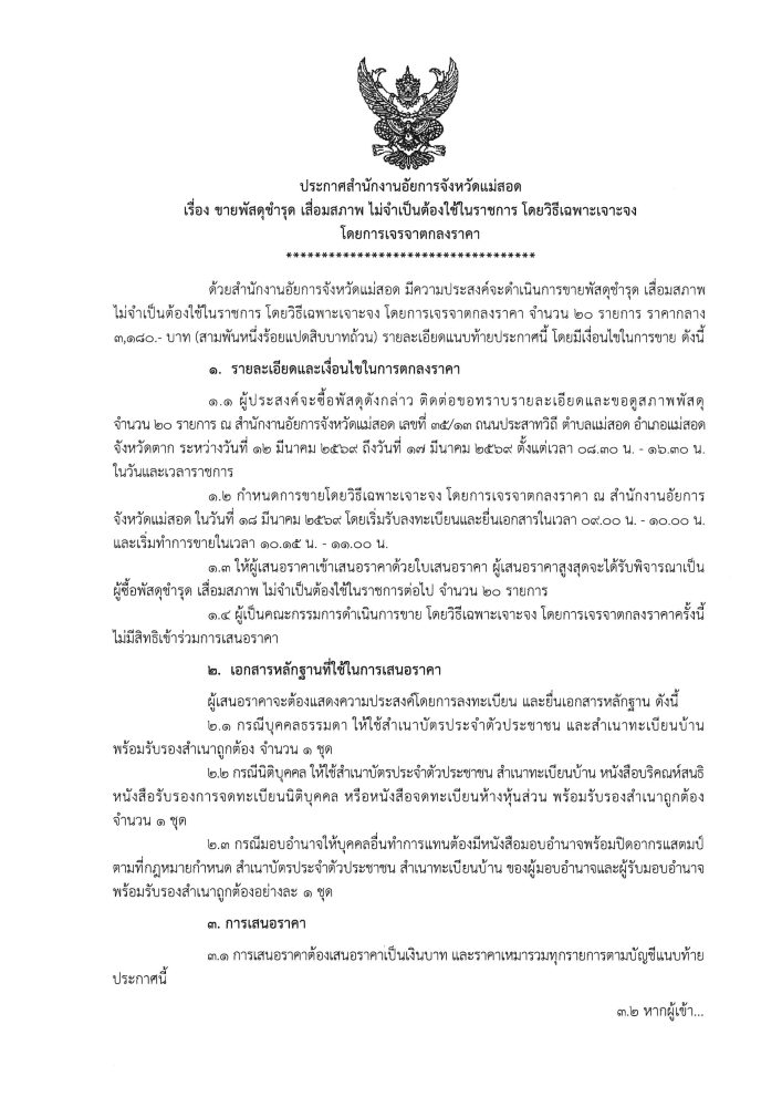 ประกาศ เรื่อง ขายพัสดุชำรุด เสื่อมสภาพ ไม่จำเป็นต้องใช้ในราชการ โดยวิธีเฉพาะเจาะจง โดยการเจรจาตกลงราคา