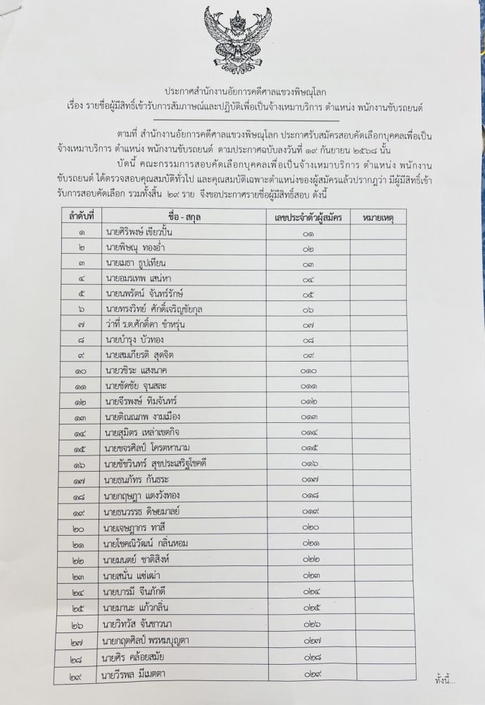 ประกาศรายชื่อผู้มีสิทธิ์สอบสัมภาษณ์ และปฏิบัติ ในตำแหน่ง พนักงานขับรถยนต์ (จ้างเหมาบริการ)