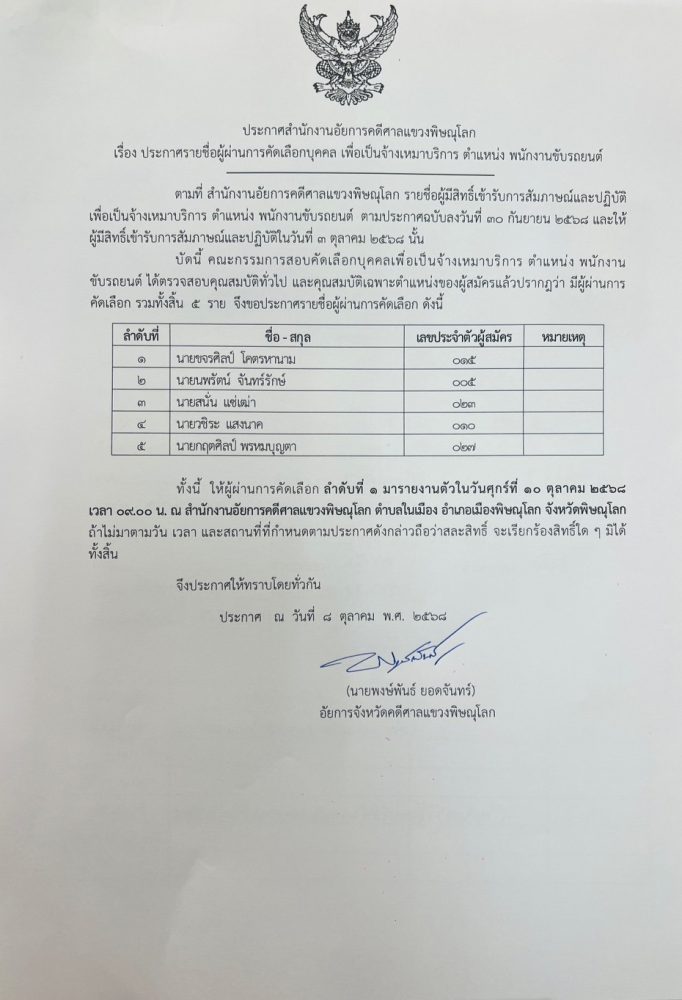 วัน ศุกร์ ที่ 5 ธันวาคม 2568 เวลา 06.30 น.นายพงษ์พันธ์ ยอดจันทร์ อัยการจังหวัดคดีศาลแขวงพิษณุโลก
