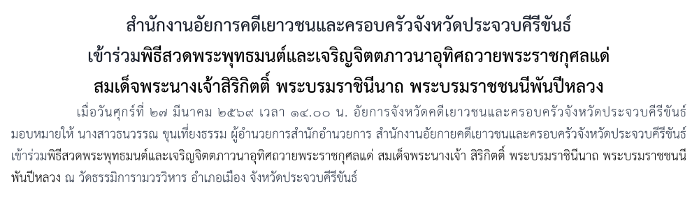 สำนักงานอัยการคดีเยาวชนและครอบครัวจังหวัดประจวบคีรีขันธ์ เข้าร่วมในพิธีเจริญพระพุทธมนต์ถวายพระพรชัยมงคลแด่ พระบาทสมเด็จพระเจ้าอยู่หัว และพระบรมวงศานุวงศ์ ประจำปีพุทธศักราช 2568