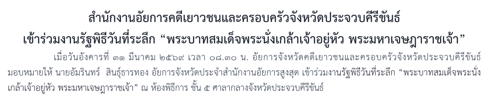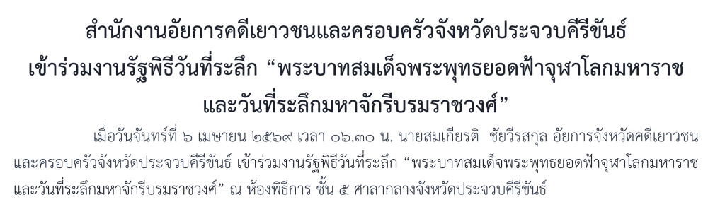 ในวันเสาร์ที่ 6 เมษายน 2567 นางตะวัน ตังคโนภาส อัยการจังหวัดคดีเยาวชนและครอบครัวจังหวัดประจวบคีรีขันธ์ มอบหมายผู้แทน นางสาวสัจธรรม หนูขาว รองอัยการจังหวัด และคณะ เข้าร่วมพิธีถวายเครื่องราชสักการะ (พานพุ่มดอกไม้สด), พิธีสวดพระพุทธมนต์และพิธีทำบุญตักบาตรถวายพระราชกุศล (ต่อเนื่องจากพิธีวางพานพุ่มดอกไม้สด) เนื่องในโอกาสวันที่ระลึก “พระบาทสมเด็จพระพุทธยอดฟ้าจุฬาโลก และวันที่ระลึกมหาจักรีบรมราชวงค์” ประจำปี พ.ศ.2567 ณ บริเวณลานอเนกประสงค์ ศาลากลางจังหวัดประจวบคีรีขันธ์