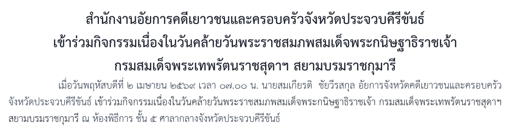 สำนักงานอัยการคดีเยาวชนและครอบครัวจังหวัดประจวบคีรีขันธ์ เข้าร่วมกิจกรรมเนื่องในโอกาสวันคล้ายวันประสูติ สมเด็จพระเจ้าลูกเธอ เจ้าฟ้าพัชรกิติยาภา นเรนทิราเทพยวดี กรมหลวงราชสาริณีสิริพัชร มหาวัชรราชธิดา