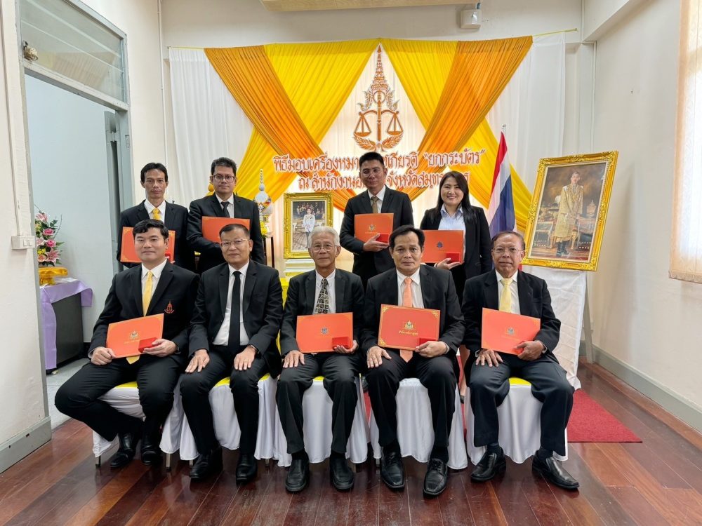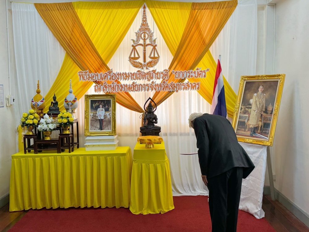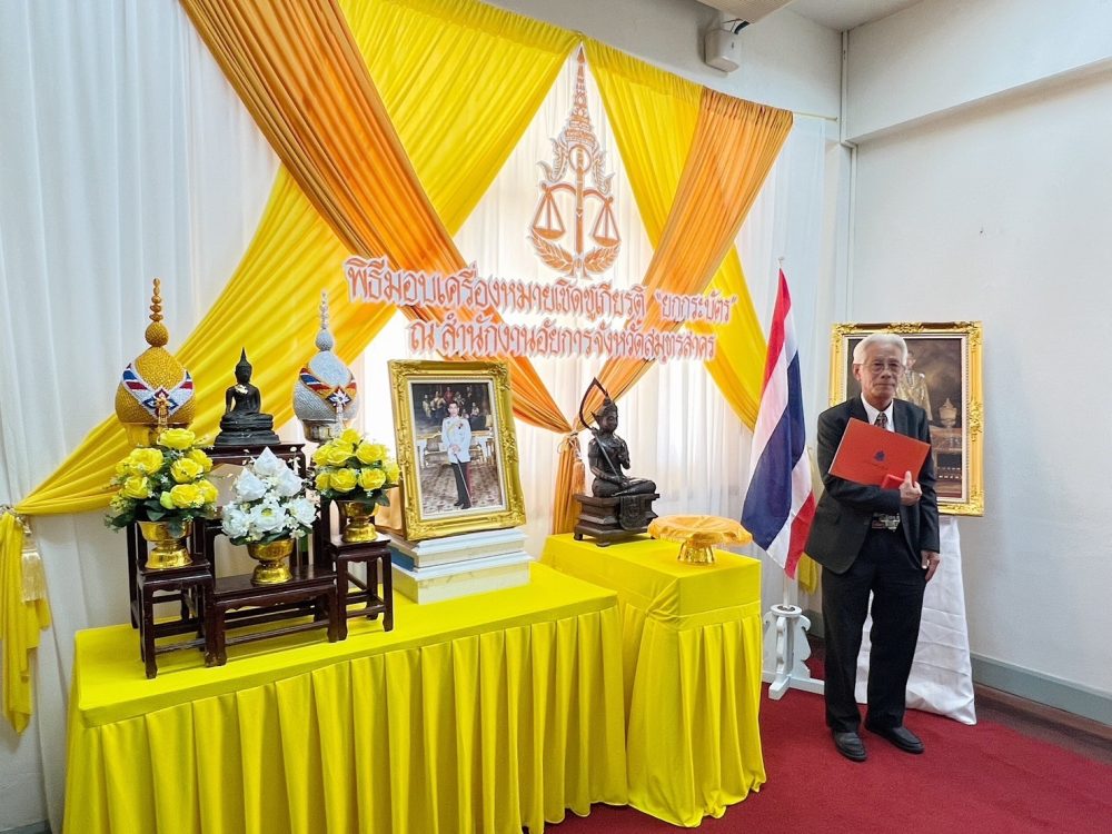 นางสาวเนาวรัตน์ โรจน์ชีวิน อัยการจังหวัดประจำสำนักงานอัยการสูงสุด พร้อมด้วย นายปริญญา โปตะวณิช อัยการอาวุโส สำนักงานอัยการคดีเยาวชนและครอบครัวจังหวัดสมุทรสาคร รับมอบเครื่องหมายเชิดชูเกียรติ “ยกกระบัตร” สำนักงานอัยการสูงสุด