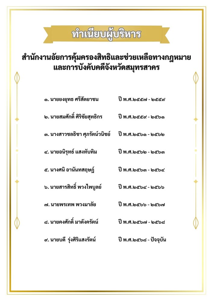 สำนักงานอัยการคุ้มครองสิทธิและช่วยเหลือทางกฎหมายและการบังคับคดีจังหวัดสมุทรสาคร โดยใช้ชื่อย่อว่า สคชจ.สมุทรสาคร จึงได้เริ่มเปิดทำการมานับแต่บัดนั้น เป็นต้นไป