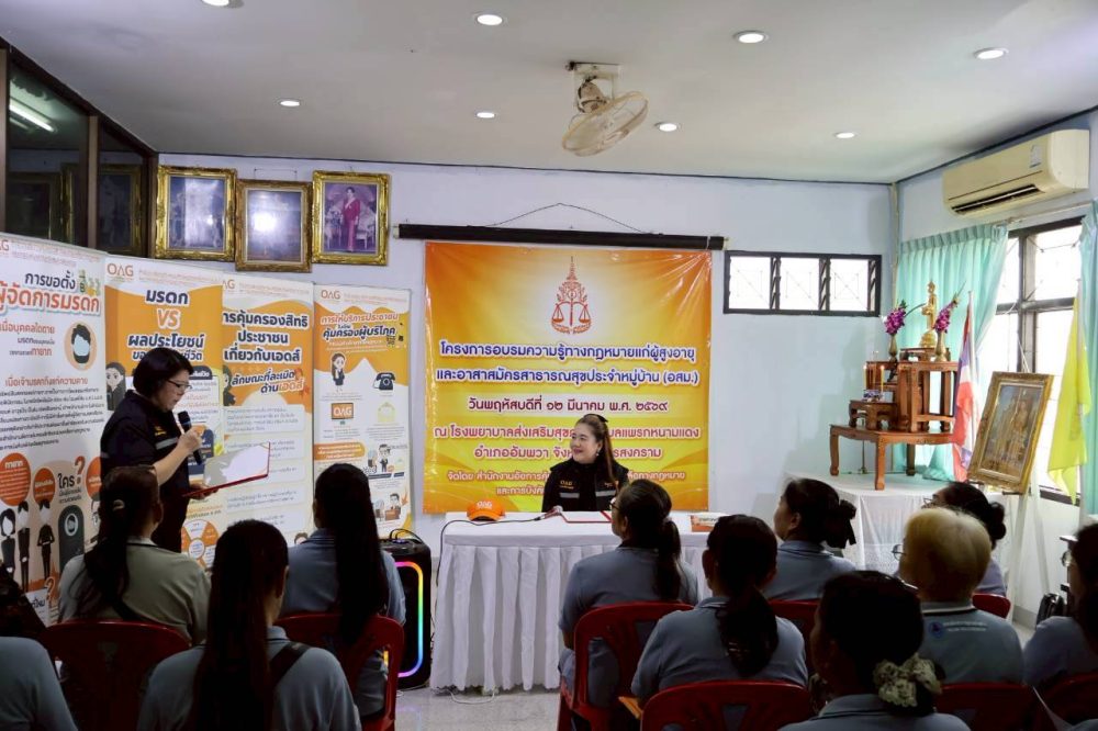 วันพฤหัสบดี ที่ 12 มีนาคม 2569 เวลา 08.30น. สำนักงานอัยการคุ้มครองสิทธิและช่วยเหลือทางกฎหมายและการบังคับคดีจังหวัดสมุทรสงครามจัดโครงการอบรมความรู้ทางกฎหมายแก่ผู้สูงอายุและอาสาสมัครสาธารณสุขประจำหมู่บ้าน (อสม.) ณ โรงพยาบาลส่งเสริมสุขภาพตำบลแพรกหนามแดง อำเภออัมพวา จังหวัดสมุทรสงคราม โดยมีวัตถุประสงค์เพื่อเป็นการส่งเสริมให้ผู้สูงอายุและอาสาสมัครสาธารณสุขประจำหมู่บ้าน (อสม.) ได้มีความรู้ ความเข้าใจในกฎหมายที่เกี่ยวข้องกับผู้สูงอายุ ได้รู้ถึงสิทธิผู้สูงอายุที่พึงได้รับตามที่กำหนดในพระราชบัญญัติผู้สูงอายุ พ.ศ. ๒๕๔๖ (พ.ศ. 2553) ลงวันที่ 15 ธันวาคม พ.ศ. 2553 การดูแลสุขภาพผู้สูงอายุ รวมทั้งกฎหมายที่จำเป็นในการดำเนินชีวิตประจำวัน และกฎหมายเกี่ยวกับการคุ้มครองผู้บริโภค และการลดการตรีตรา ขจัดการเลือกปฏิบัติ มิให้เกิดการรังเกียจกีดกันตีตรา เลือกปฏิบัติต่อผู้ติดเชื้อเอชไอวี หรือผู้เกี่ยวเนื่องกับเอชไอวี เพราะมนุษย์ทุกคนมีศักดิ์ศรีความเป็นมนุษย์อย่างเสมอภาพเท่าเทียมกัน การให้ความรู้ ความเข้าใจกับประชาชน จึงเป็นการป้องกันการละเมิดสิทธิมนุษยชน ซึ่งมีผู้เข้ารับการอบรม จำนวน 56 คน