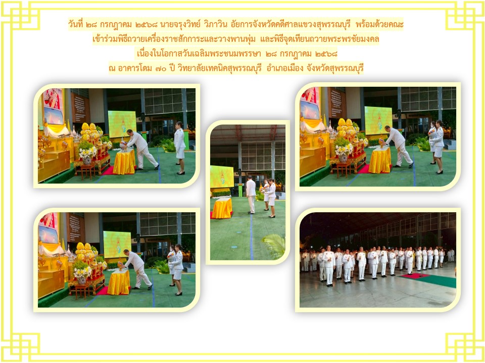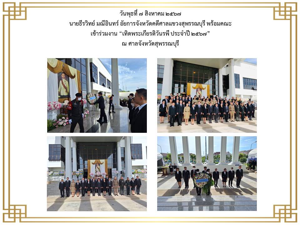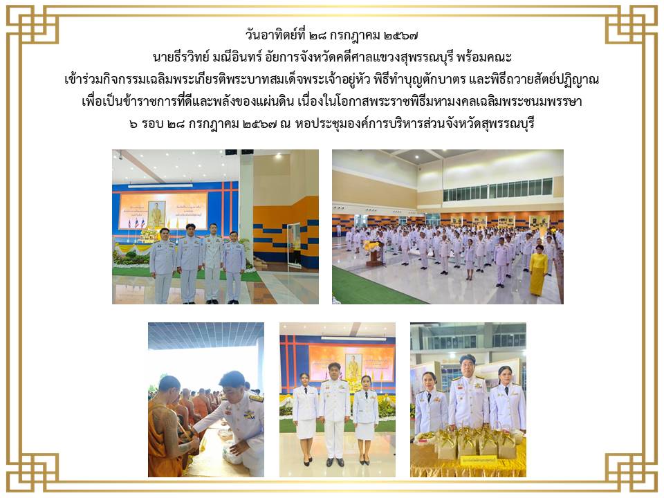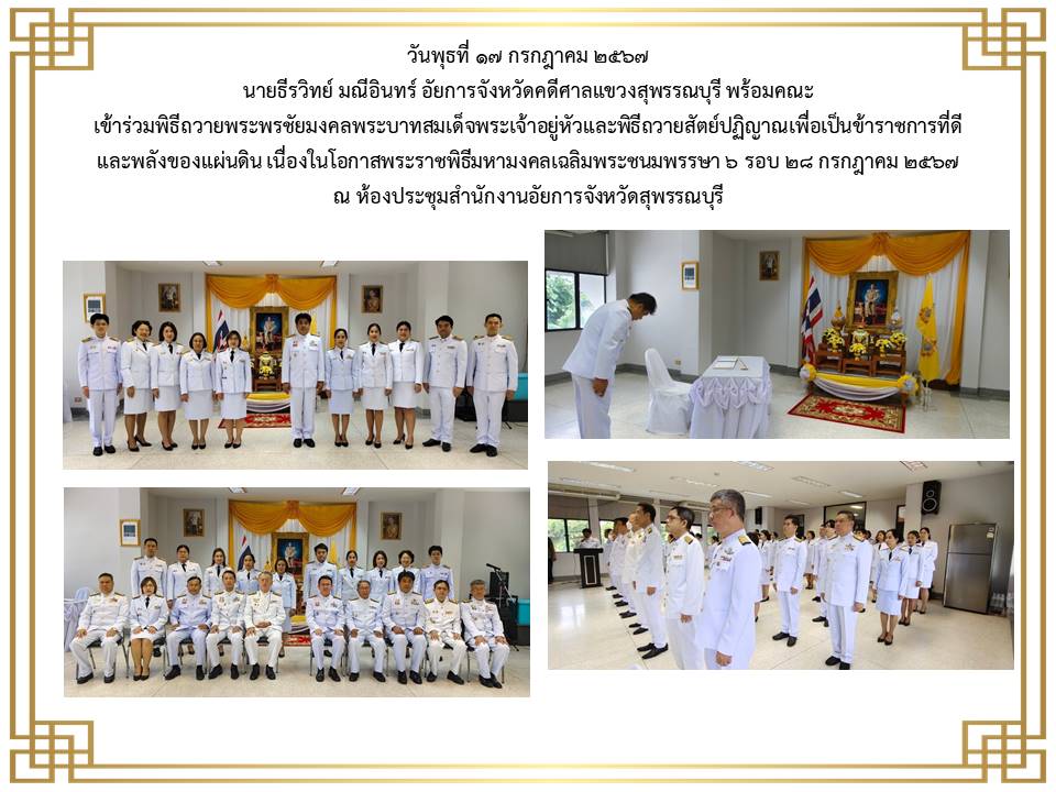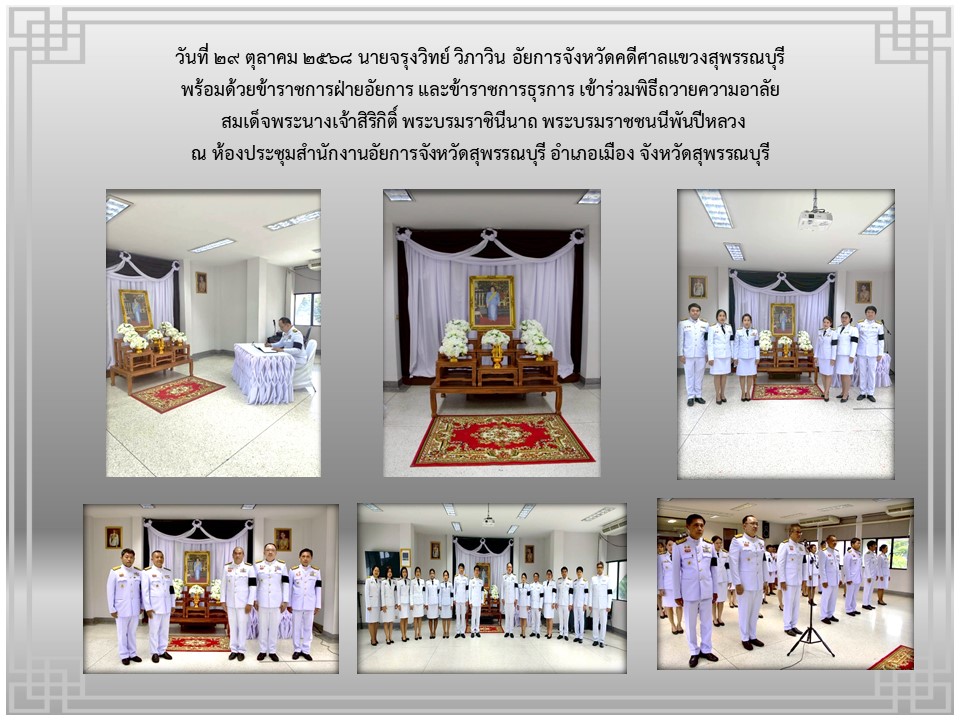 ข้าราชการฝ่ายอัยการและบุคคลากรของสำนักงานอัยการคดีศาลแขวงสุพรรณบุรี เข้าร่วมพิธีลงนามถวายพระพรชัยมงคล เนื่องในโอกาสวันเฉลิม พระชนมพระพรรษาพระบาทสมเด็จพระเจ้าอยู่หัว ประจำปีพุทธศักราช ๒๕๖๕