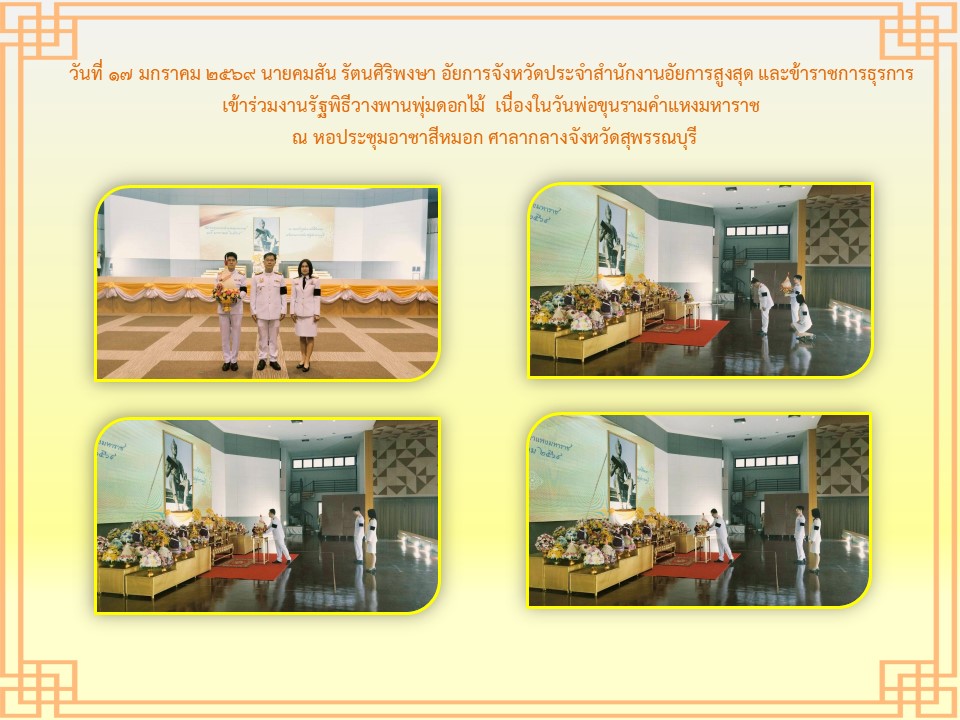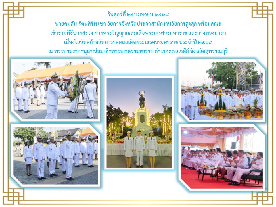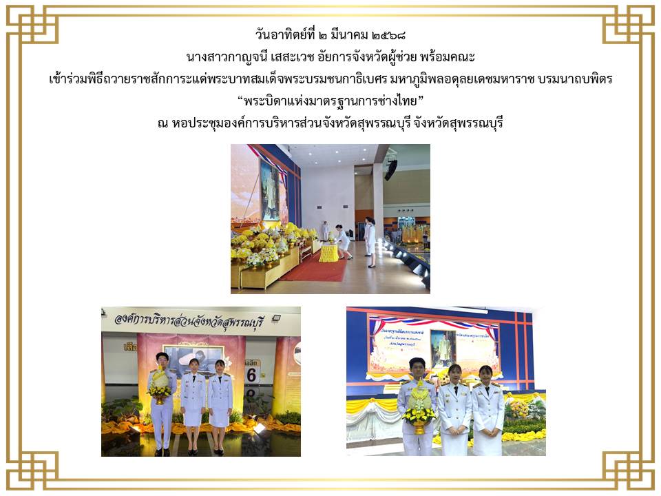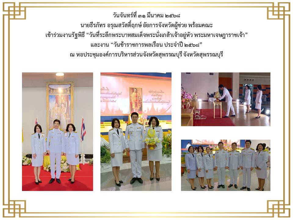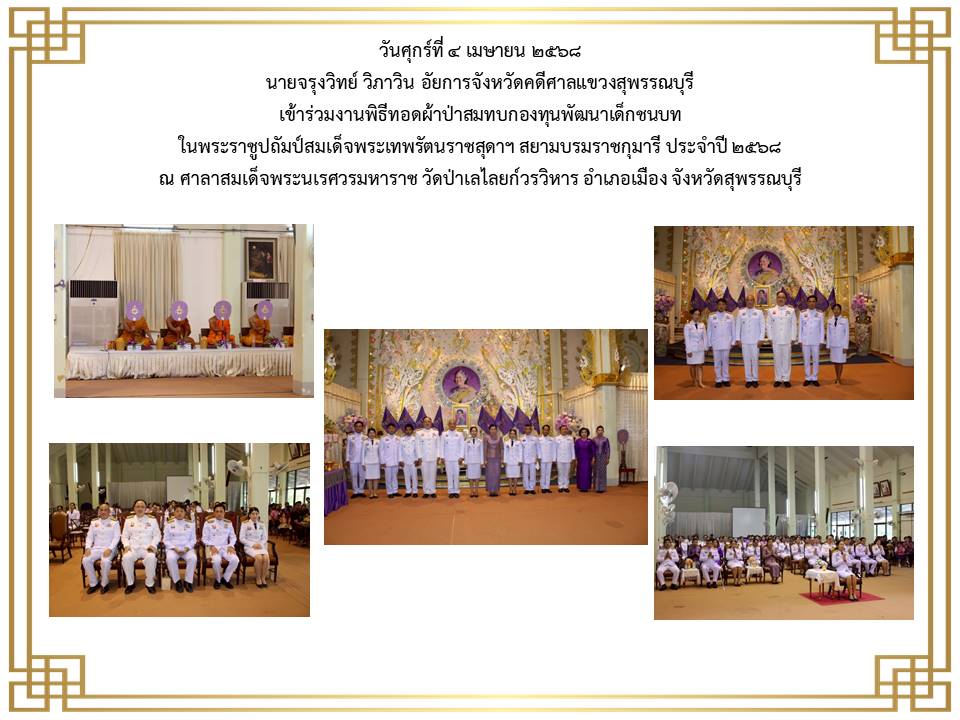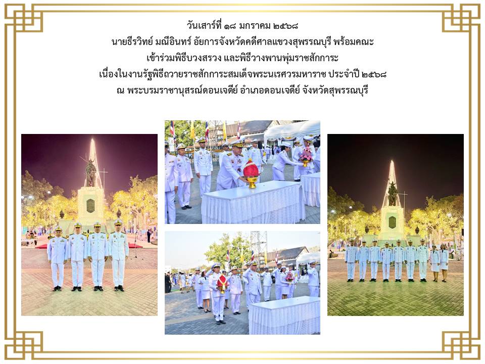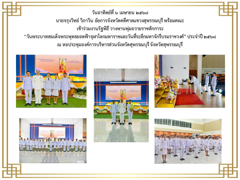 สำนักงานอัยการคดีศาลแชวงสุพรรณบุรี ได้เข้าร่วมพิธีวางพานพุ่มดอกไม้ถวายราชสักการะเนื่องในวันพระบาทสมเด็จพระพุทธยอดฟ้าจุฬาโลกมหาราชและวันที่ระลึกมหาจักรีบรมราชวงศ์” วันที่ ๖ เมษายน ๒๕๖๕ ณ หอประชุมองค์การบริหารส่วนจังหวัดสุพรรณบุรี